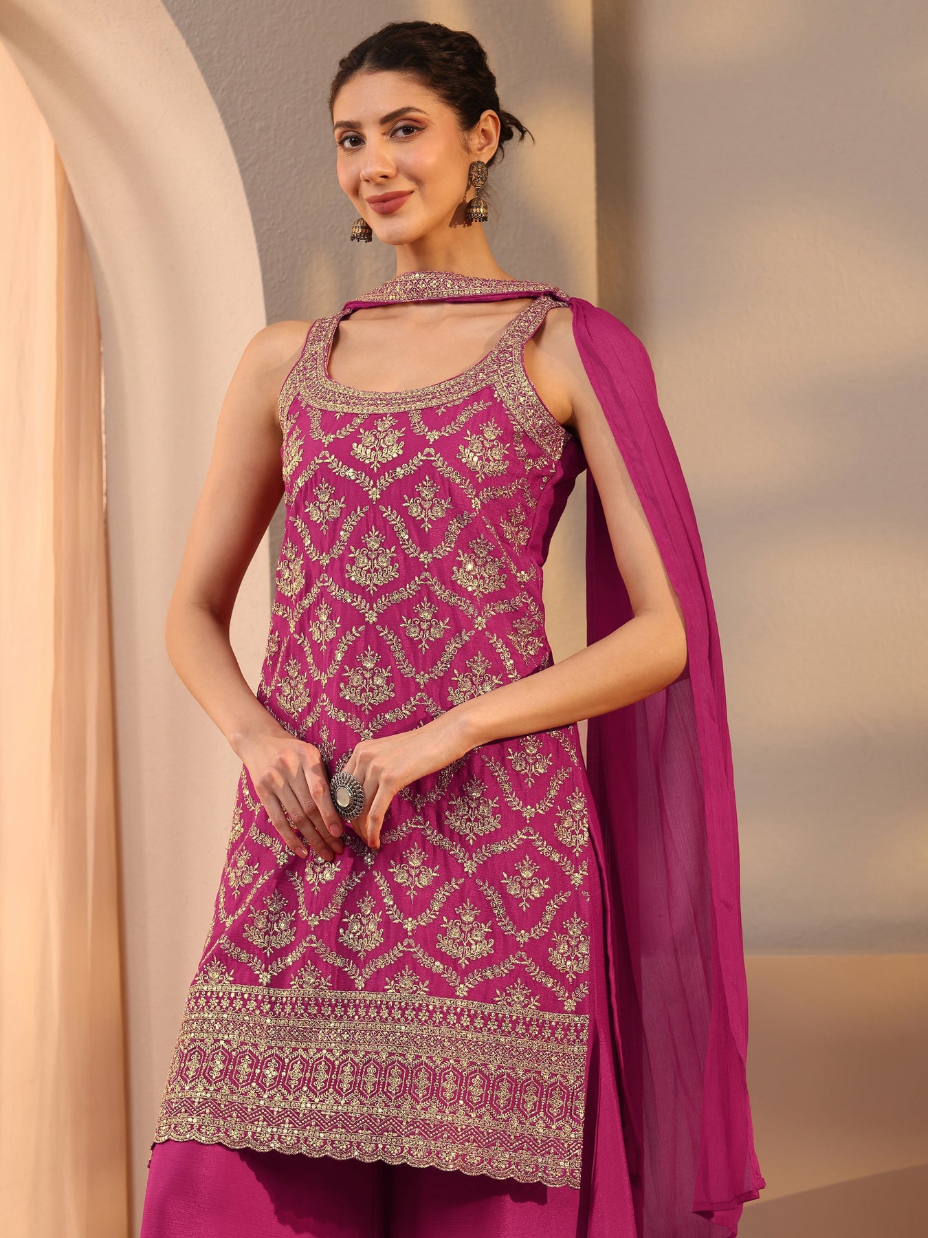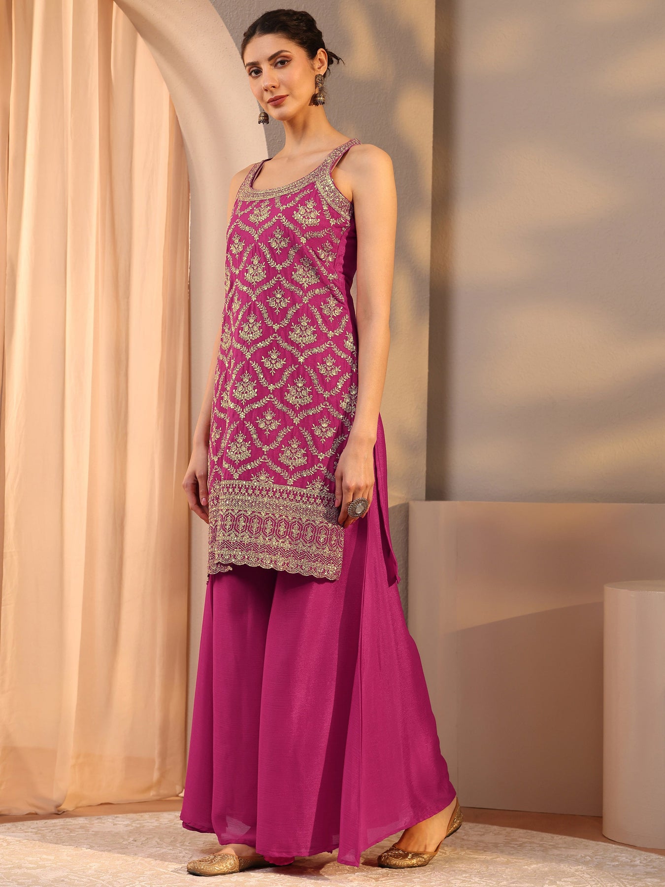 Pink Embellished Chinon Palazzo Suit Set With Dupatta