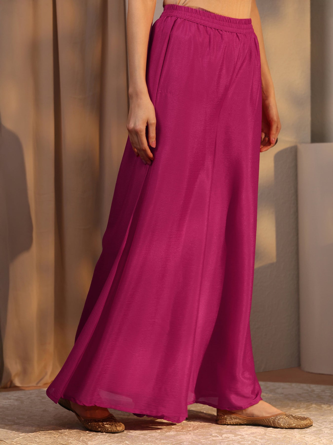 Our 3-piece Pink Chinon Straight-Fit Kurta Set features a round Neckline and statement yoke. Complemented with Lining and Palazzo Pants with a Partially Elasticated waistband, and a Solid dupatta. Adorned with floral zari embroidered, this style is perfect for Festive occasions.
