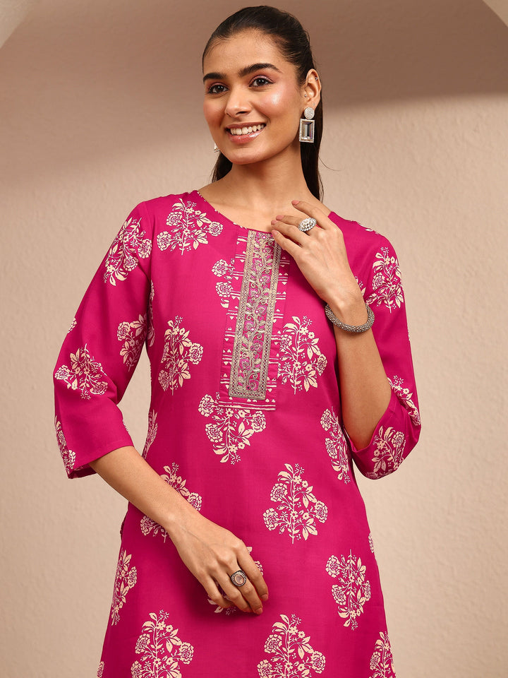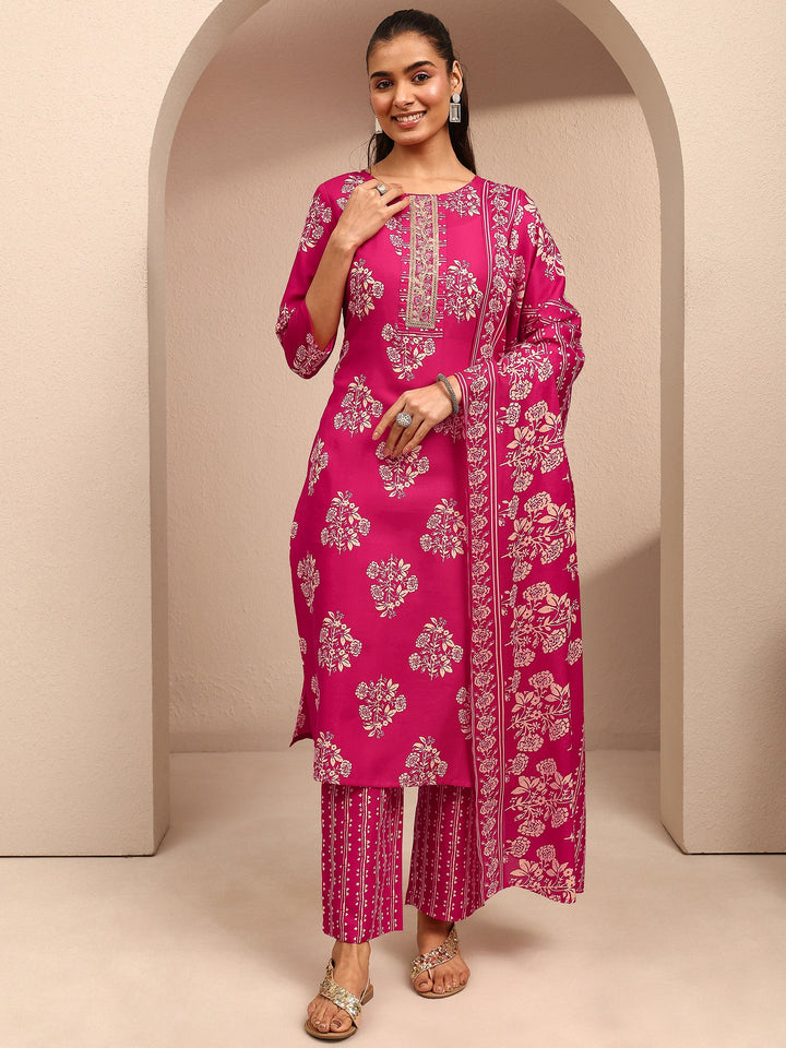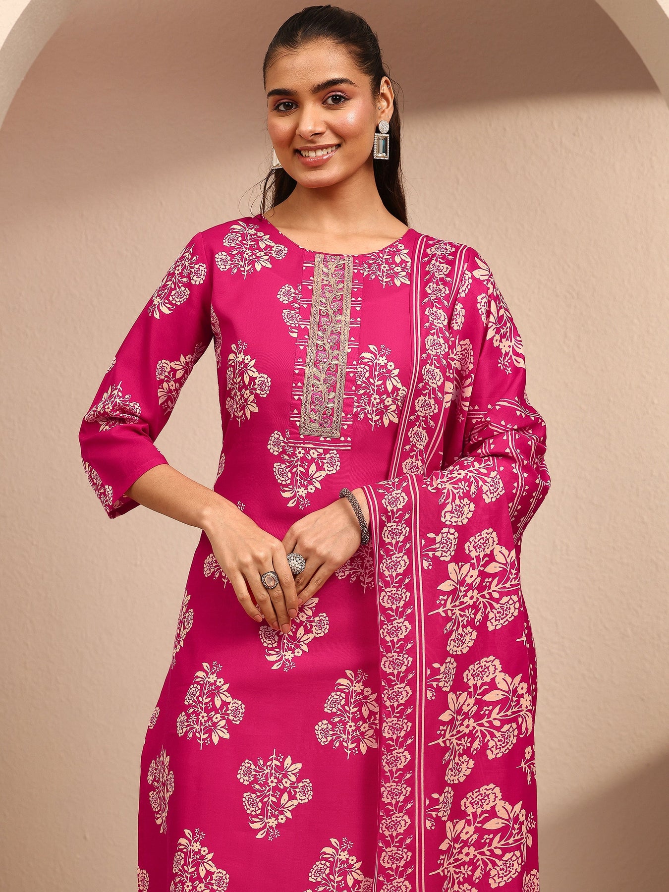 Pink Printed Cotton Blend Straight Suit Set With Dupatta