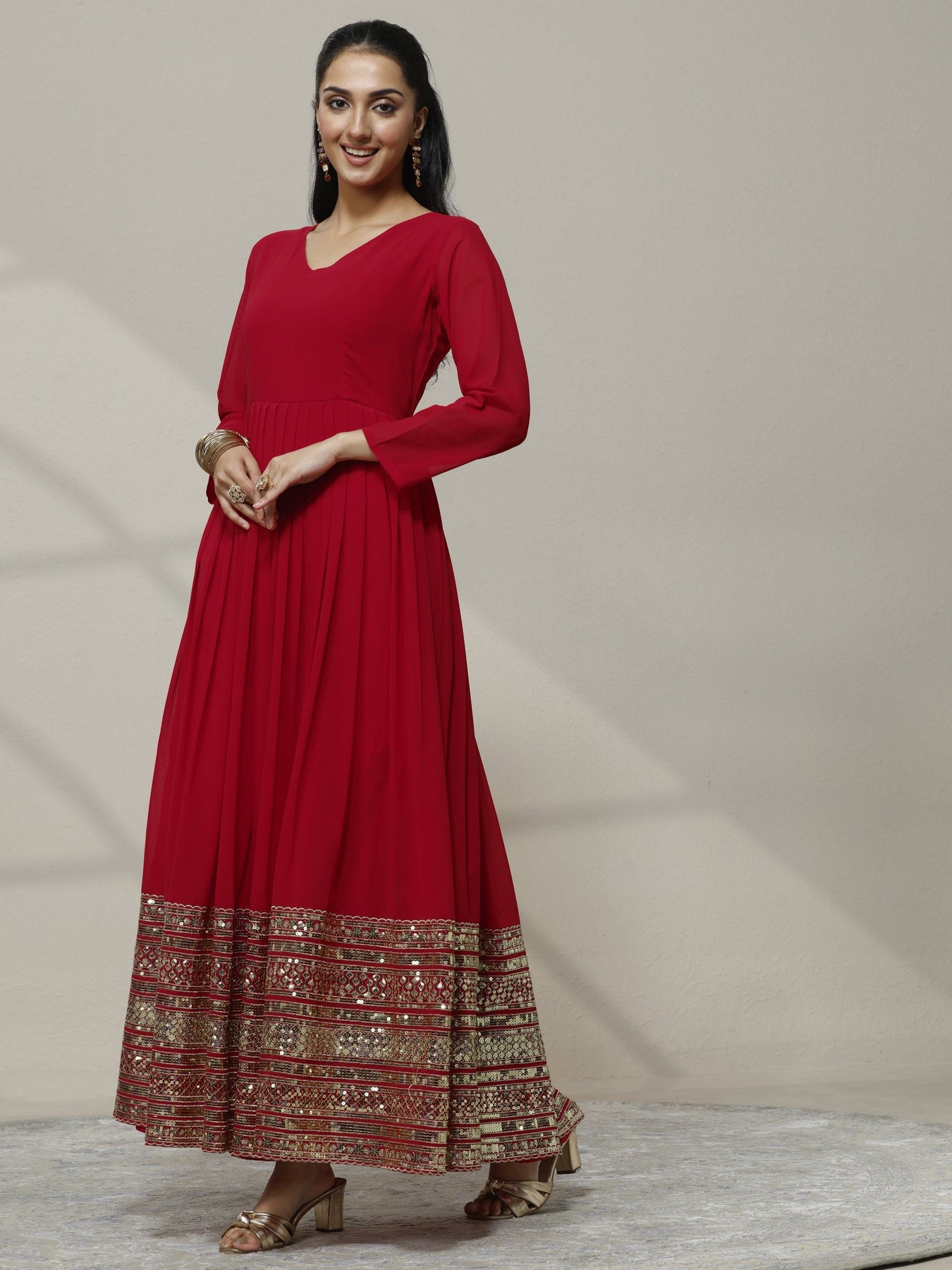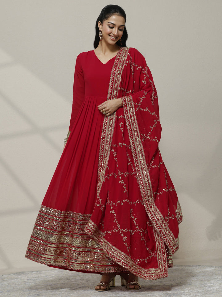 Red Embellished Georgette Anarkali Suit Set With Dupatta