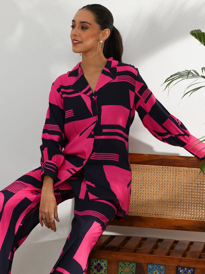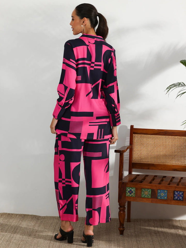 Our 2-piece pink printed rayon co-ord set features a shirt-style tunic with a buttoned-down detailing and full-length bishop sleeves. Complemented with matching trousers with a partially elasticated waistband and roomy pockets. Elevated with stylish button accents and geometric prints, this style is perfect for casual outings.