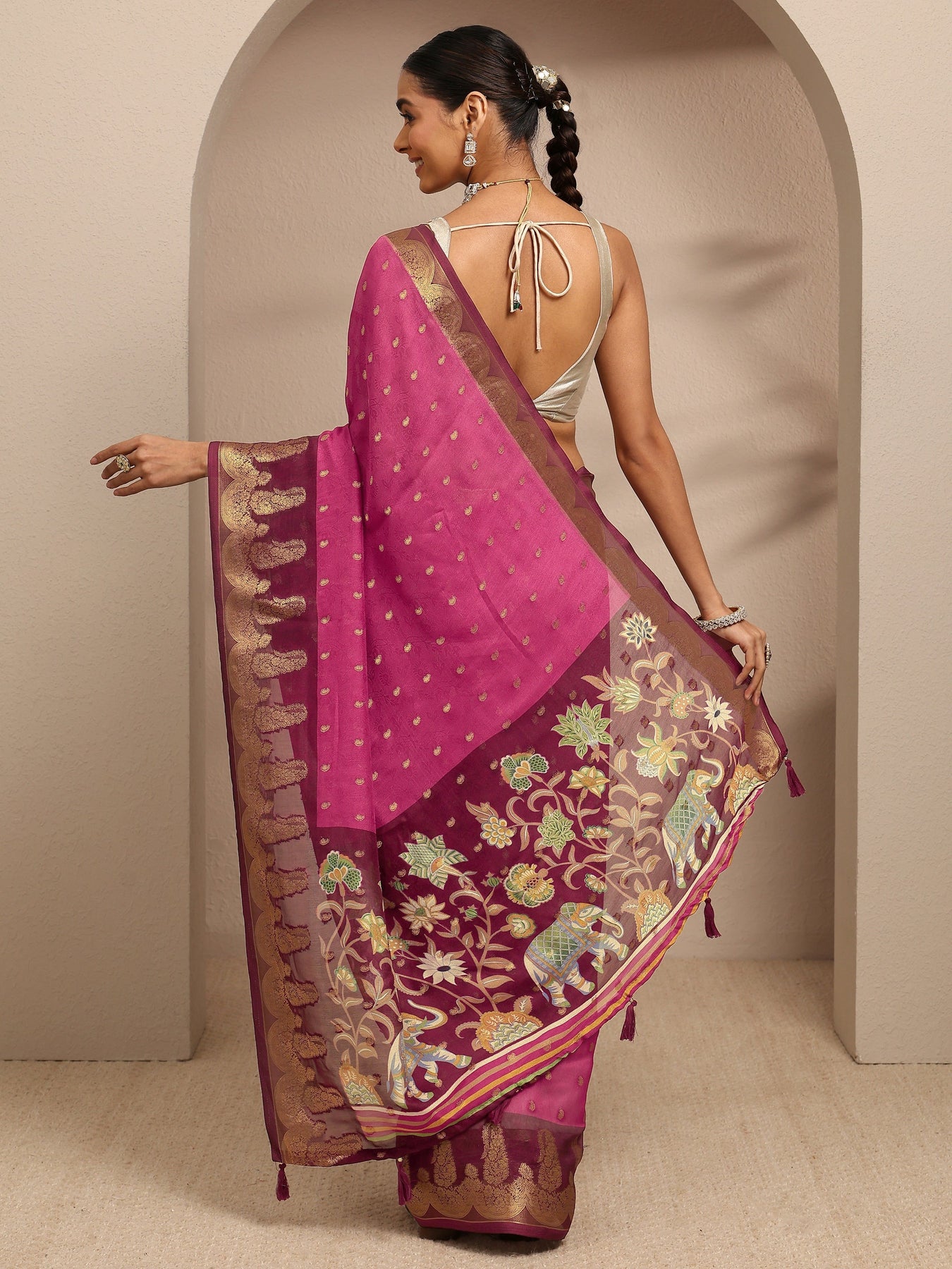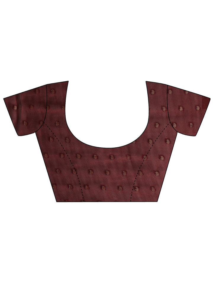 Our magenta printed silk blend saree features a captivating woven design inspired by the rich craft of Banarasi weaves. Complemented with a blouse piece. This charming saree is perfect for festive occasions.