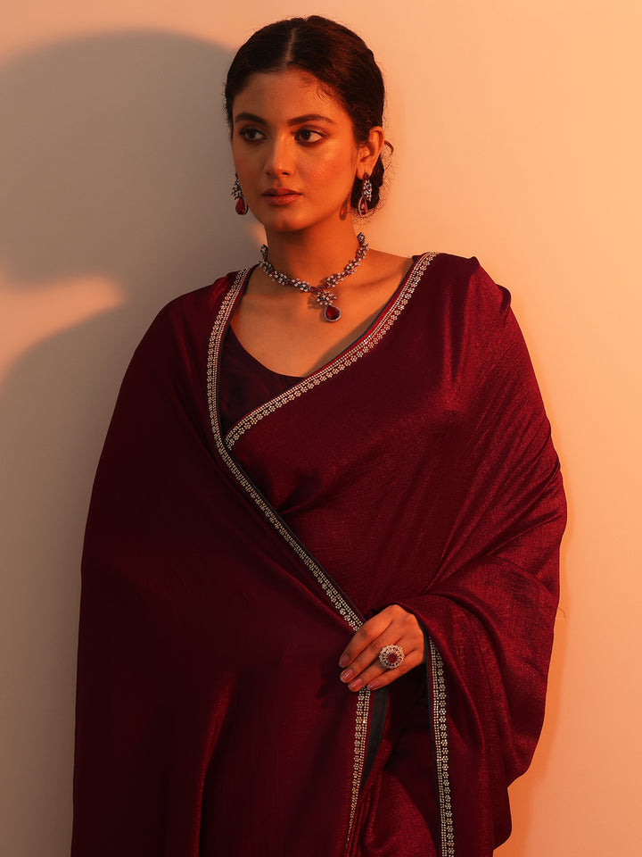 Burgundy Solid Silk Blend Saree With Unstitched Blouse Piece