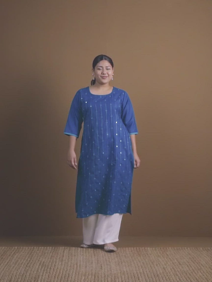 This blue round neck kurta is crafted in a straight cut with side slits. Made in cotton, featuring mirror work details and contrasting trims. Perfect for festive occasions.
