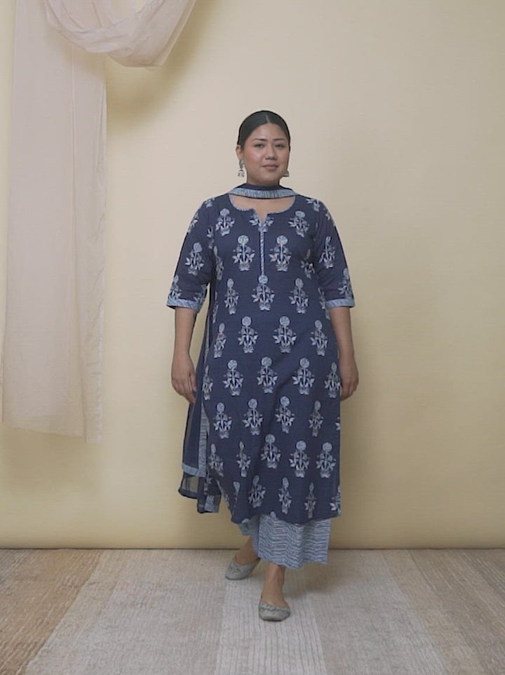 Plus Size Blue Printed Cotton Straight Kurta With Palazzos & Dupatta