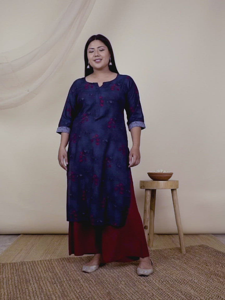 This Navy Blue round neck kurta is crafted in a straight cut with side slits. Crafted in rayon, featuring abstract-pattern florals with bright accents and contrasting trims in a notched neckline. Comfortable for daily wear.