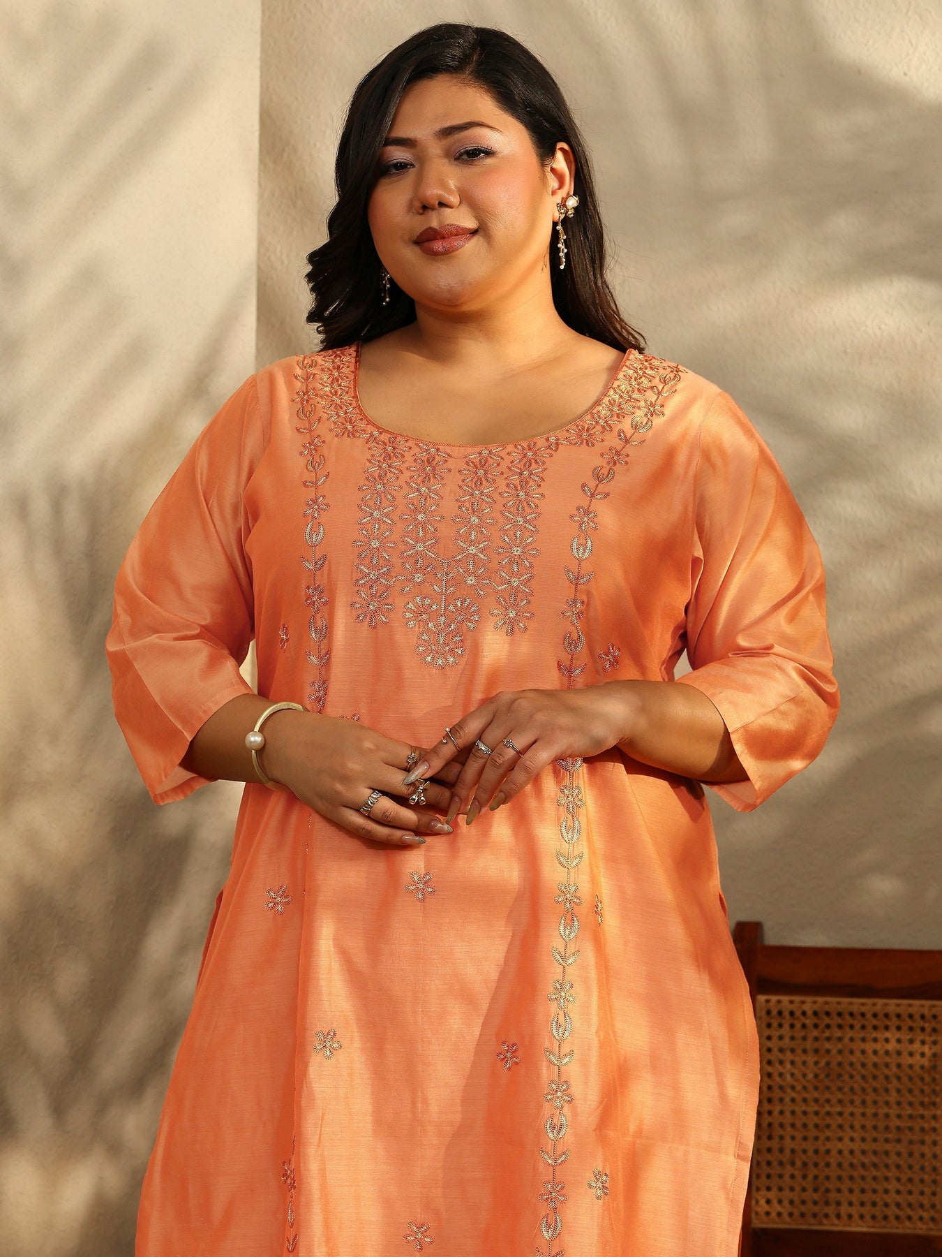 Plus Size Peach Embroidered Chanderi Silk Straight Kurta
