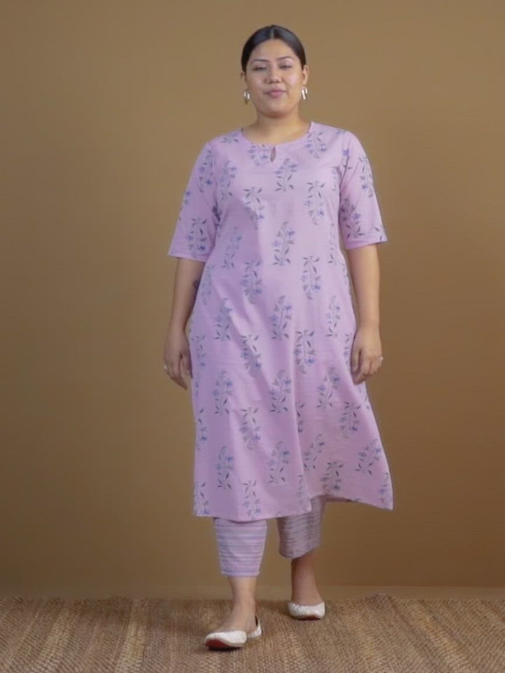 Plus Size Purple Printed Cotton A-Line Kurta With Trousers