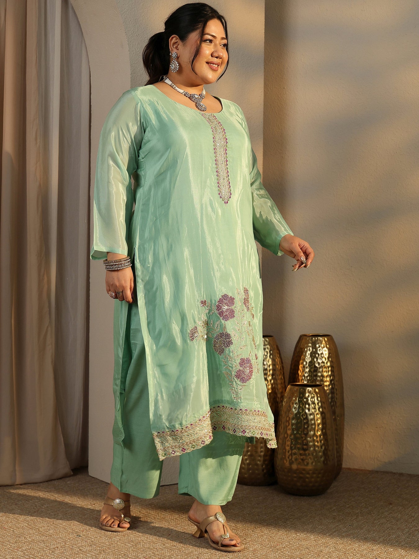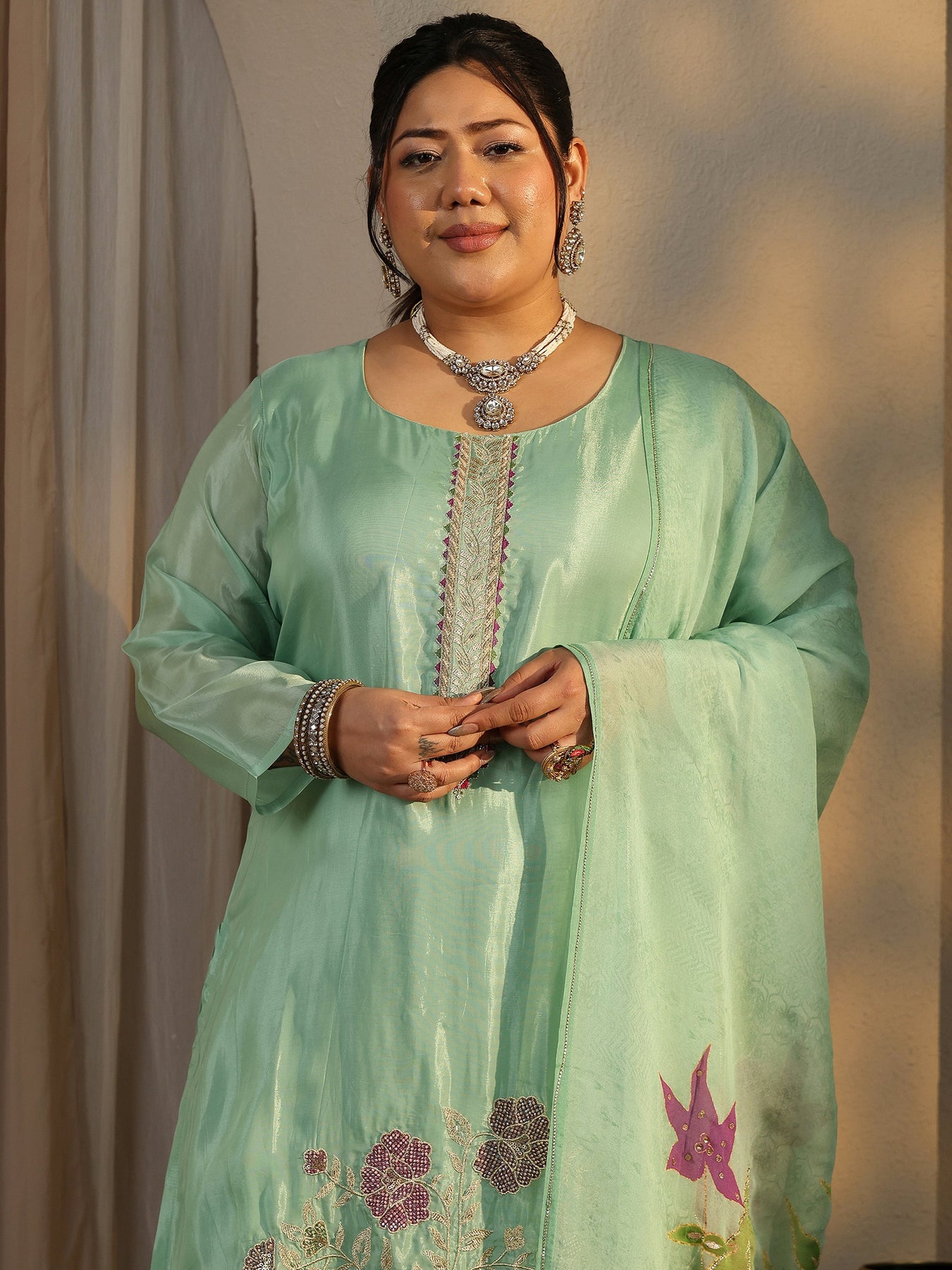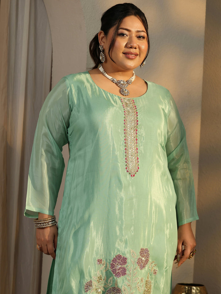 Plus Size Green Embroidered Crepe Straight Suit Set With Dupatta