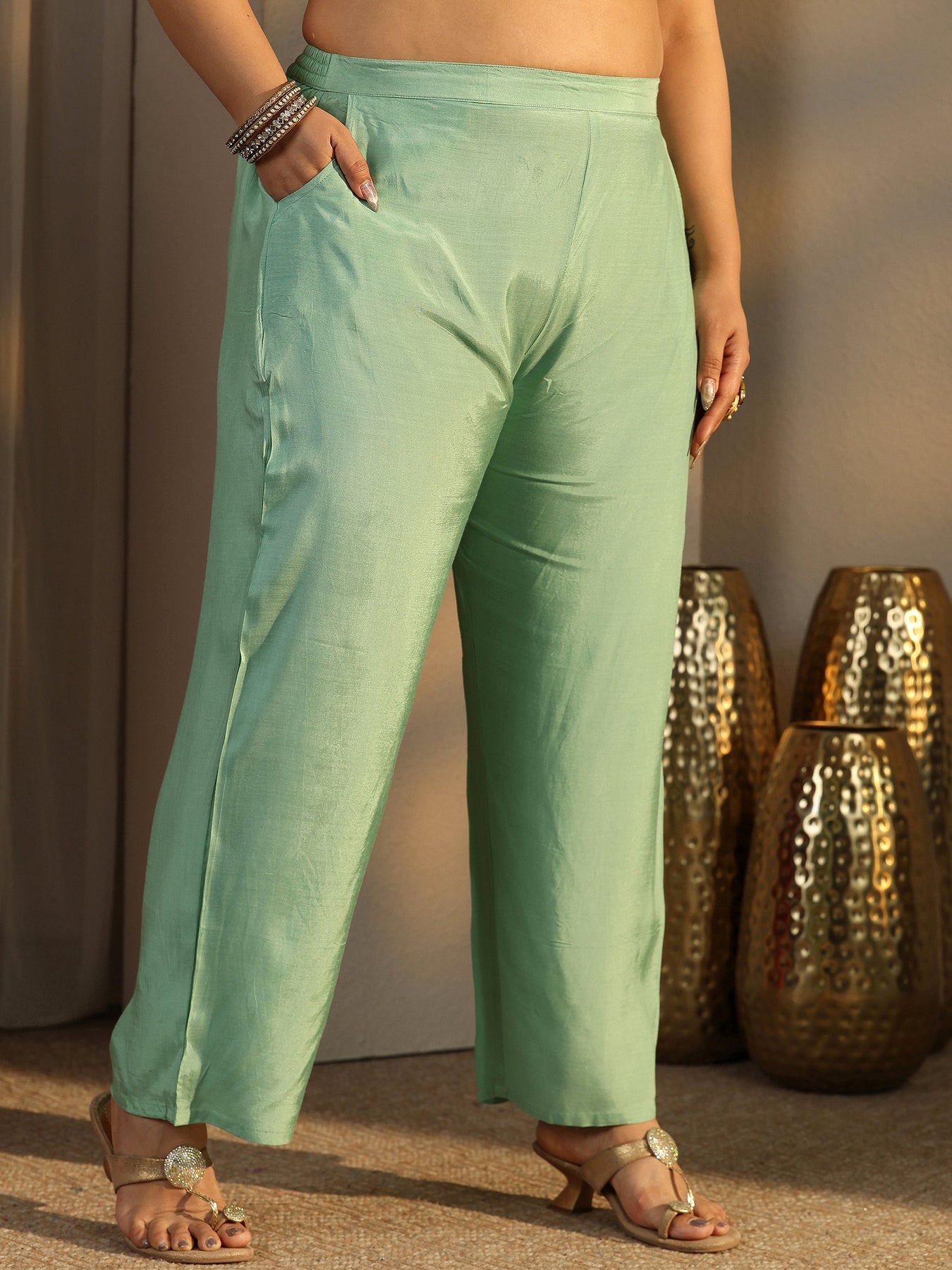 Our 3-piece sea green crepe straight-fit kurta set features a round neckline, regular sleeves, and statement yoke. Complemented with straight pants with a partially elasticated waistband and 2 pockets, and a printed dupatta. Adorned with embellished, this style is perfect for festive occasions.