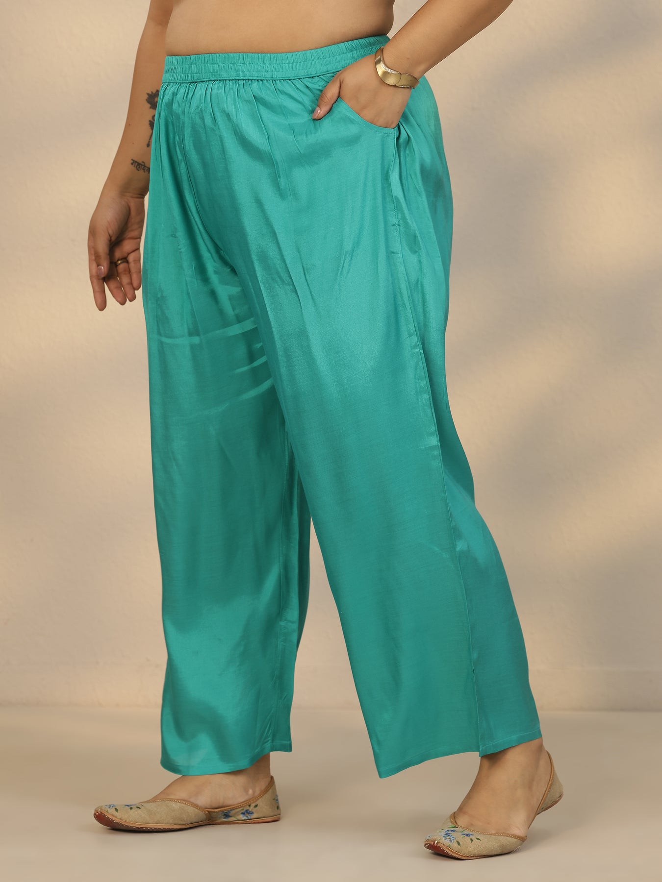 Our 3-piece sea green crepe straight-fit kurta set features a round neckline, regular sleeves, and statement yoke. Complemented with straight pants with a partially elasticated waistband and 2 pockets, and an embroidered dupatta. Adorned with Floral printed, this style is perfect for festive occasions.