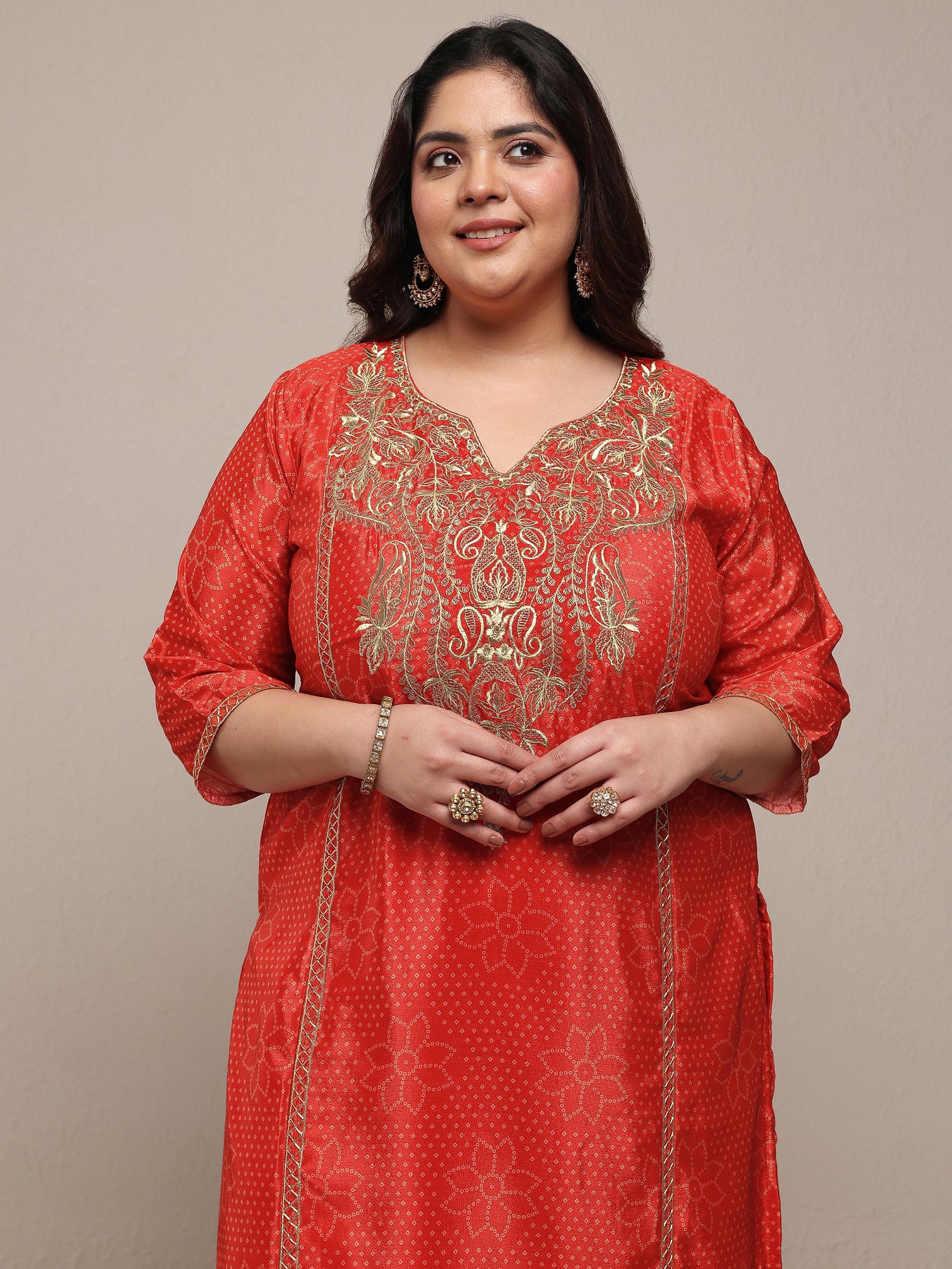 Our 3-piece Red Silk blend Kurta Set features a V-Neckline, Regular Sleeves, and statement yoke. Complemented with Palazzo Pants with a Partially Elasticated waistband and 2 pockets, and a Solid dupatta. Adorned with bandhani printed, this style is perfect for Festive occasions.