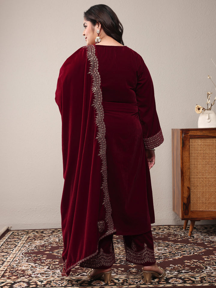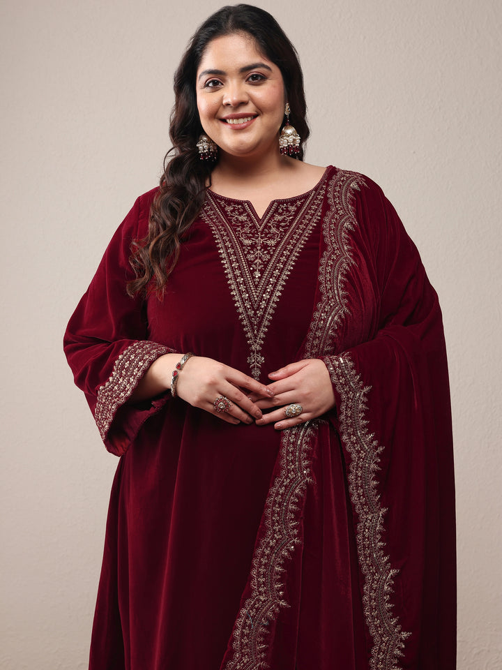 Plus Size Red Embroidered Velvet Straight Suit Set With Dupatta