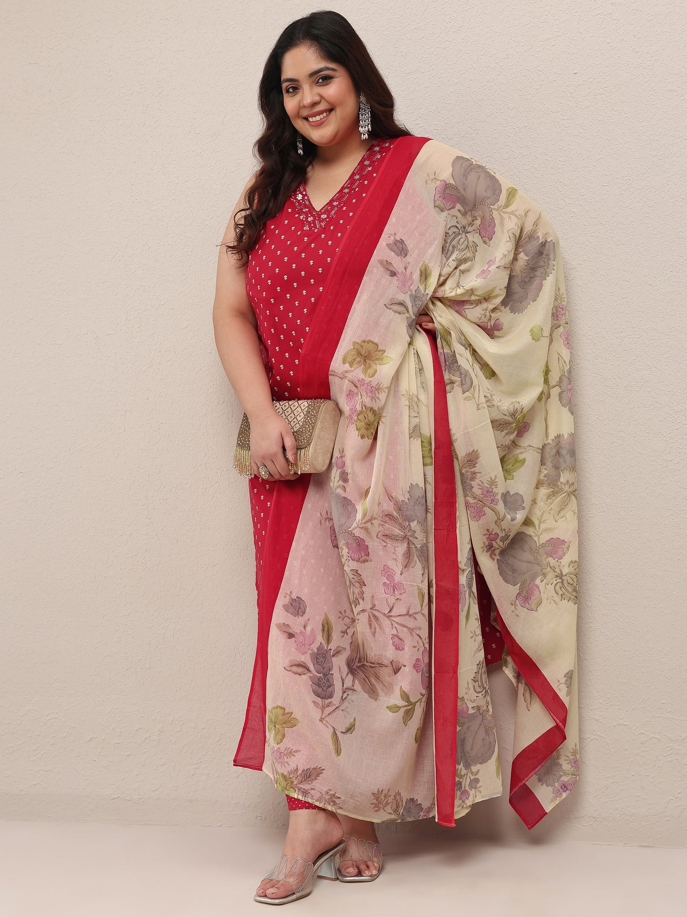 Plus Size Red Printed Cotton Blend Straight Suit Set With Dupatta