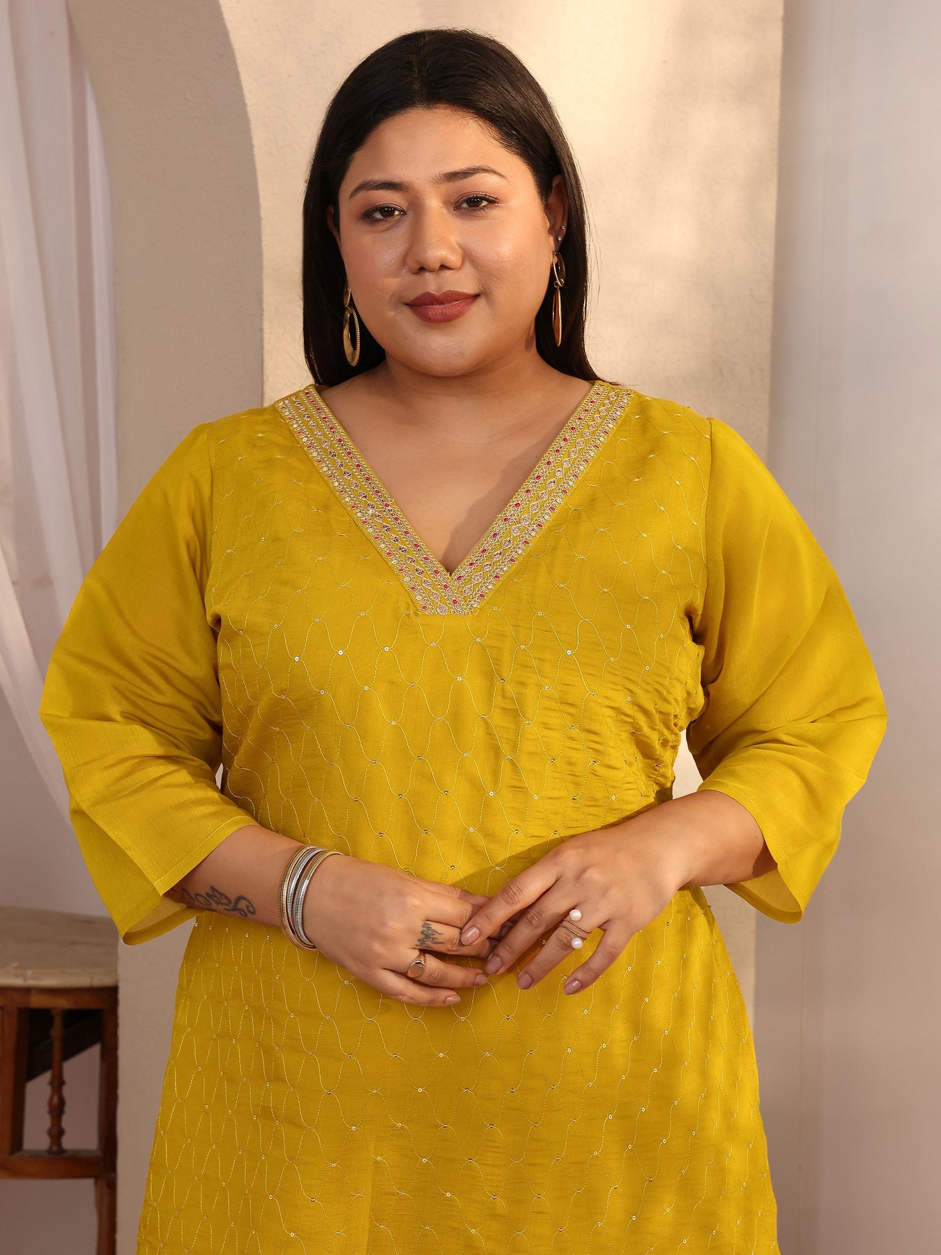 Our 1-piece mustard silk blend straight-fit kurta features a V-neckline, regular sleeves, and statement Yoke. Adorned with sequined embellished, this style is perfect for casual wear.