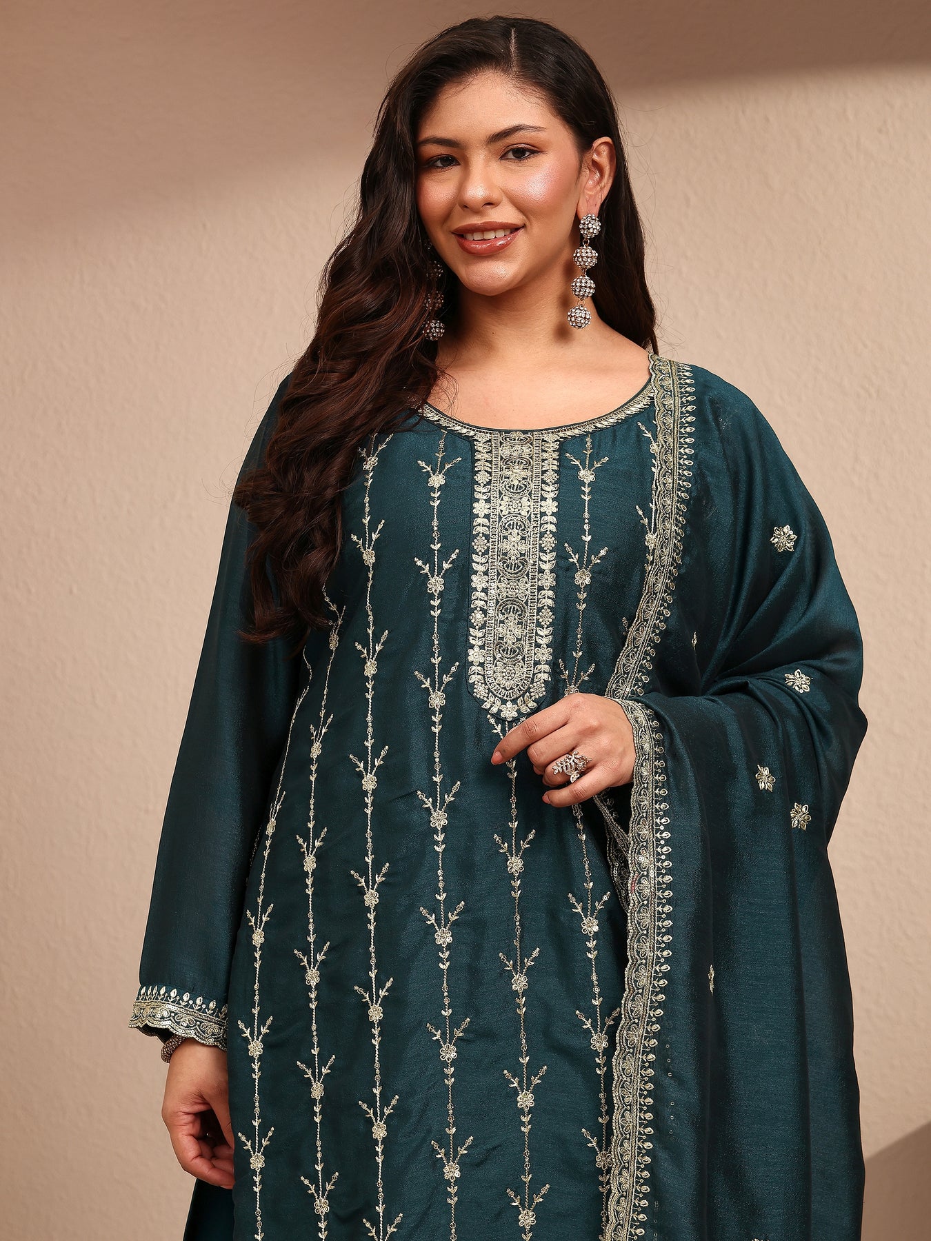Plus Size Teal Embroidered Plus Size Clothing Silk Blend Straight Suit Set With Dupatta