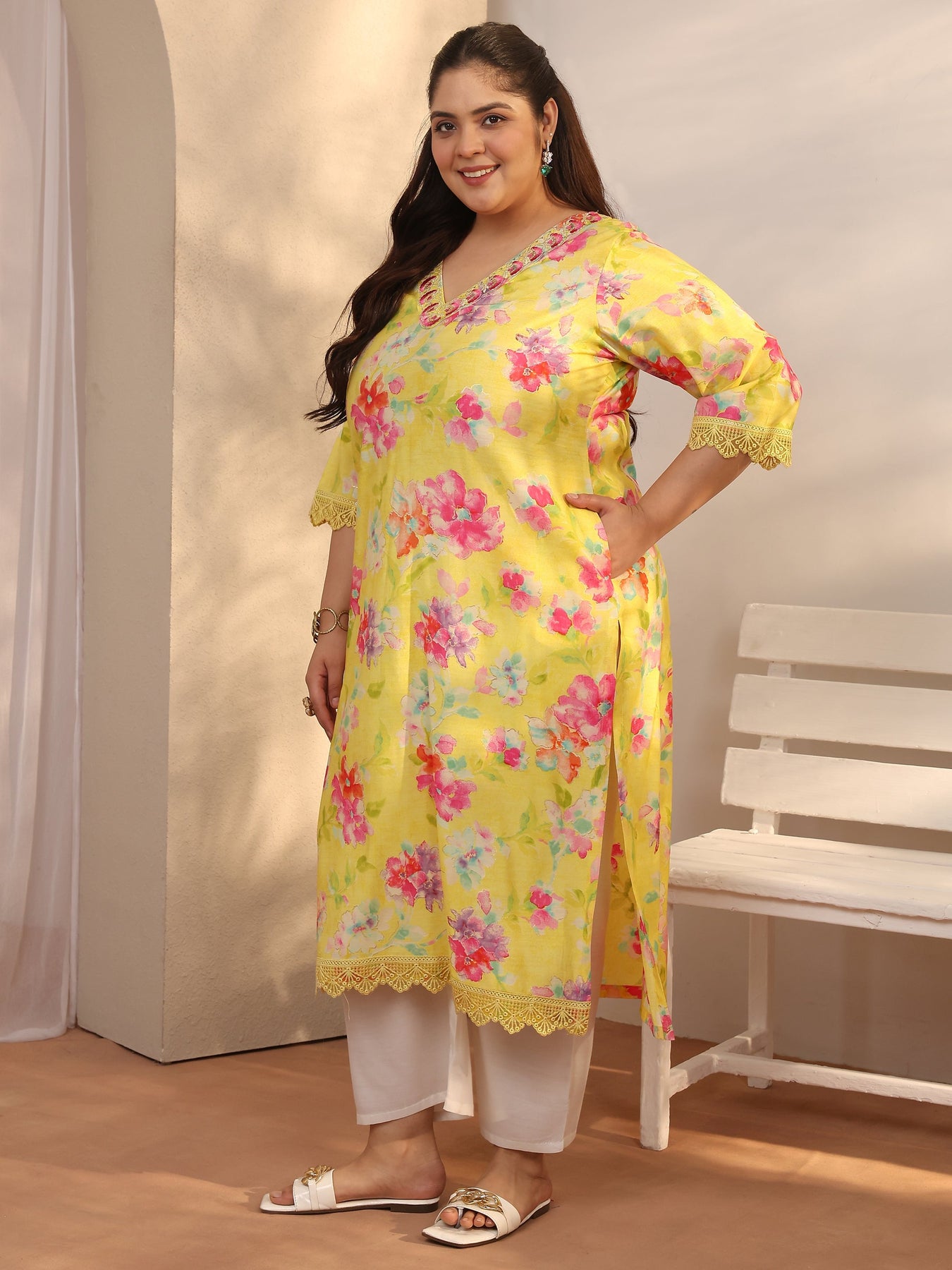 Our 1-piece yellow silk blend straight-fit kurta features a V-neckline, regular sleeves, and statement yoke. Adorned with floral print, this style is perfect for work wear and casual wear.
