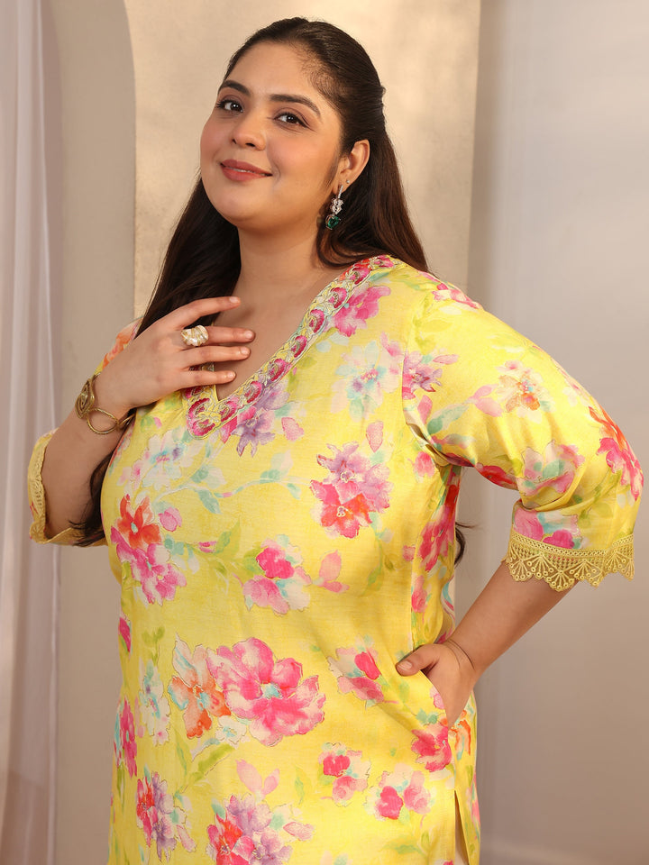Plus Size Yellow Printed Silk Blend Straight Kurta