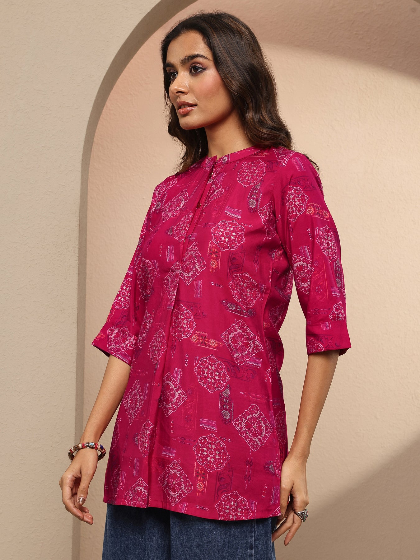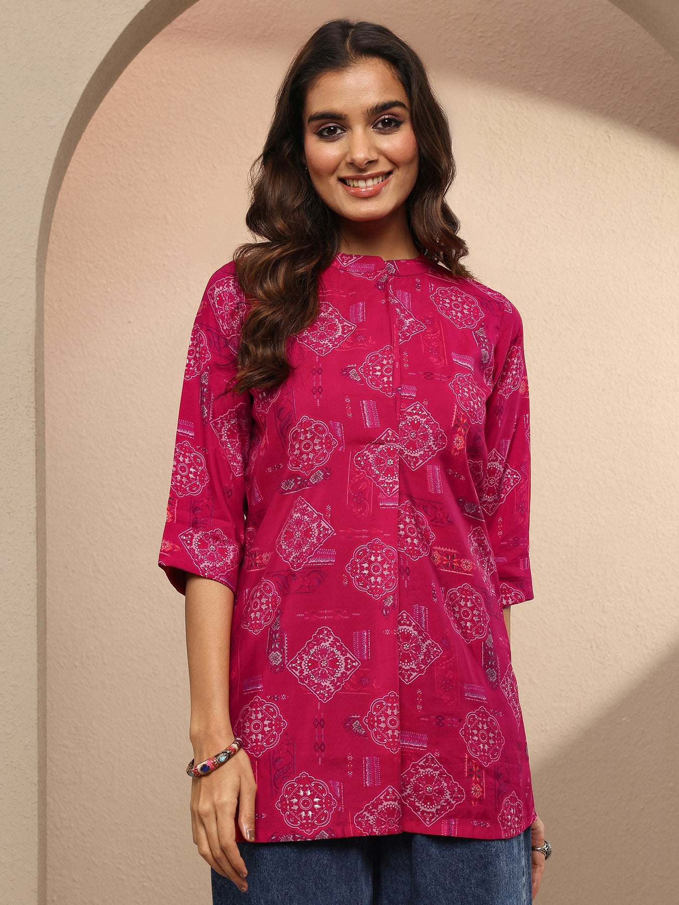 Pink Block Printed Silk Blend Straight Short Kurti