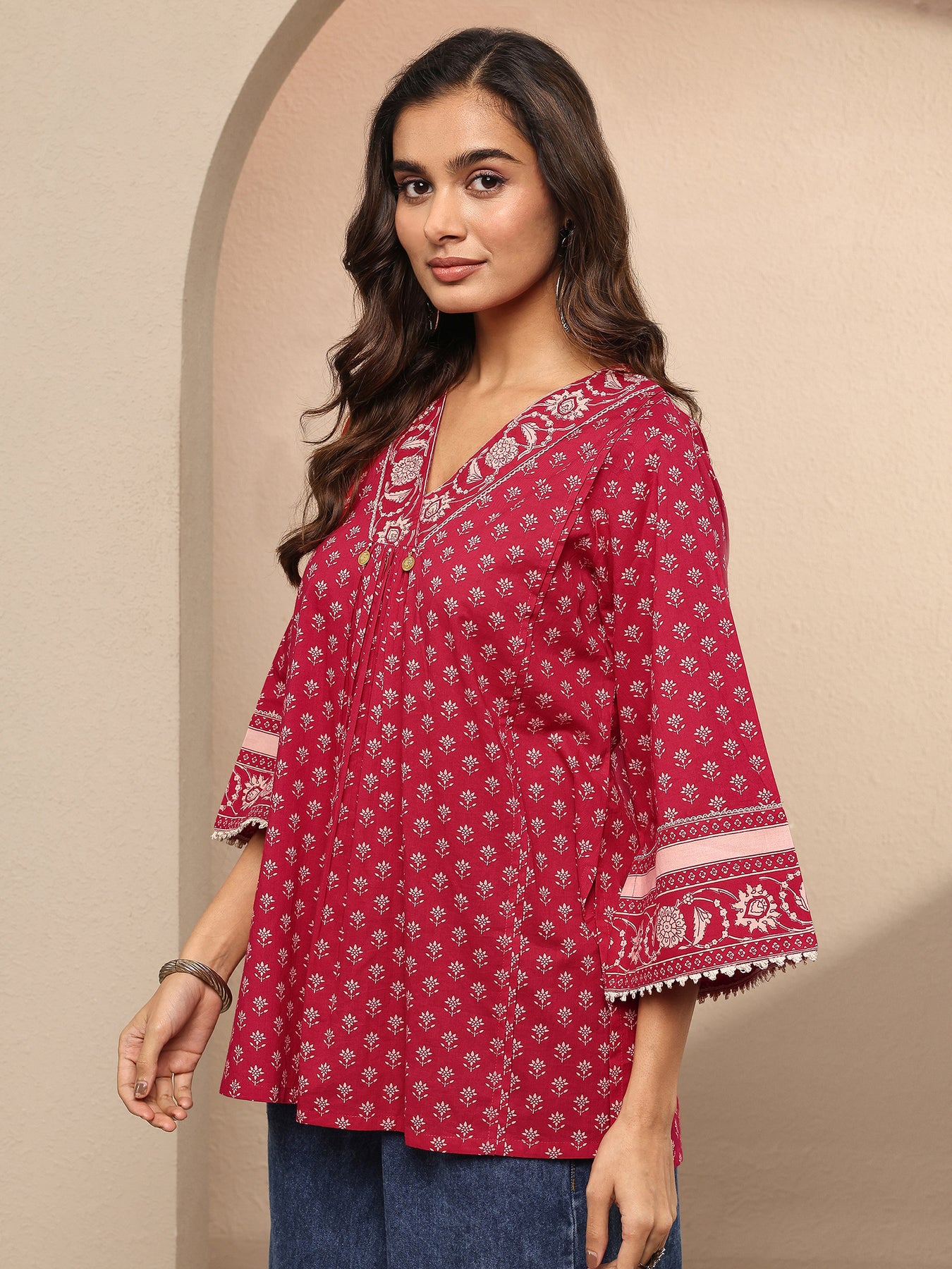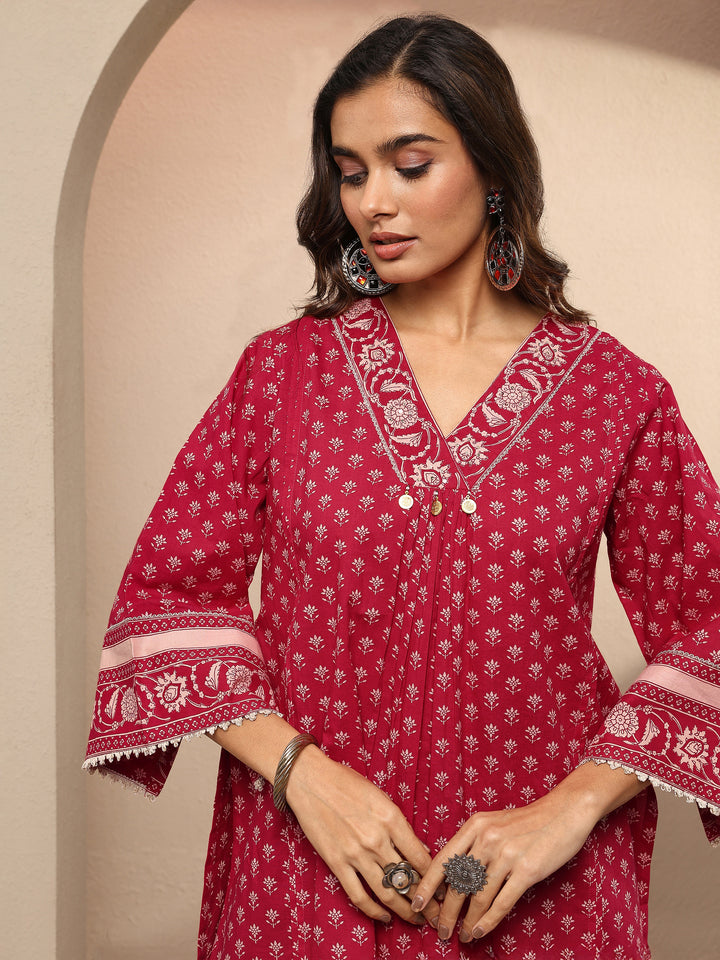 Our 1-piece red cotton A-line kurta features a V-neckline, flared sleeves. Adorned with floral print, this style is perfect for work wear and casual wear.