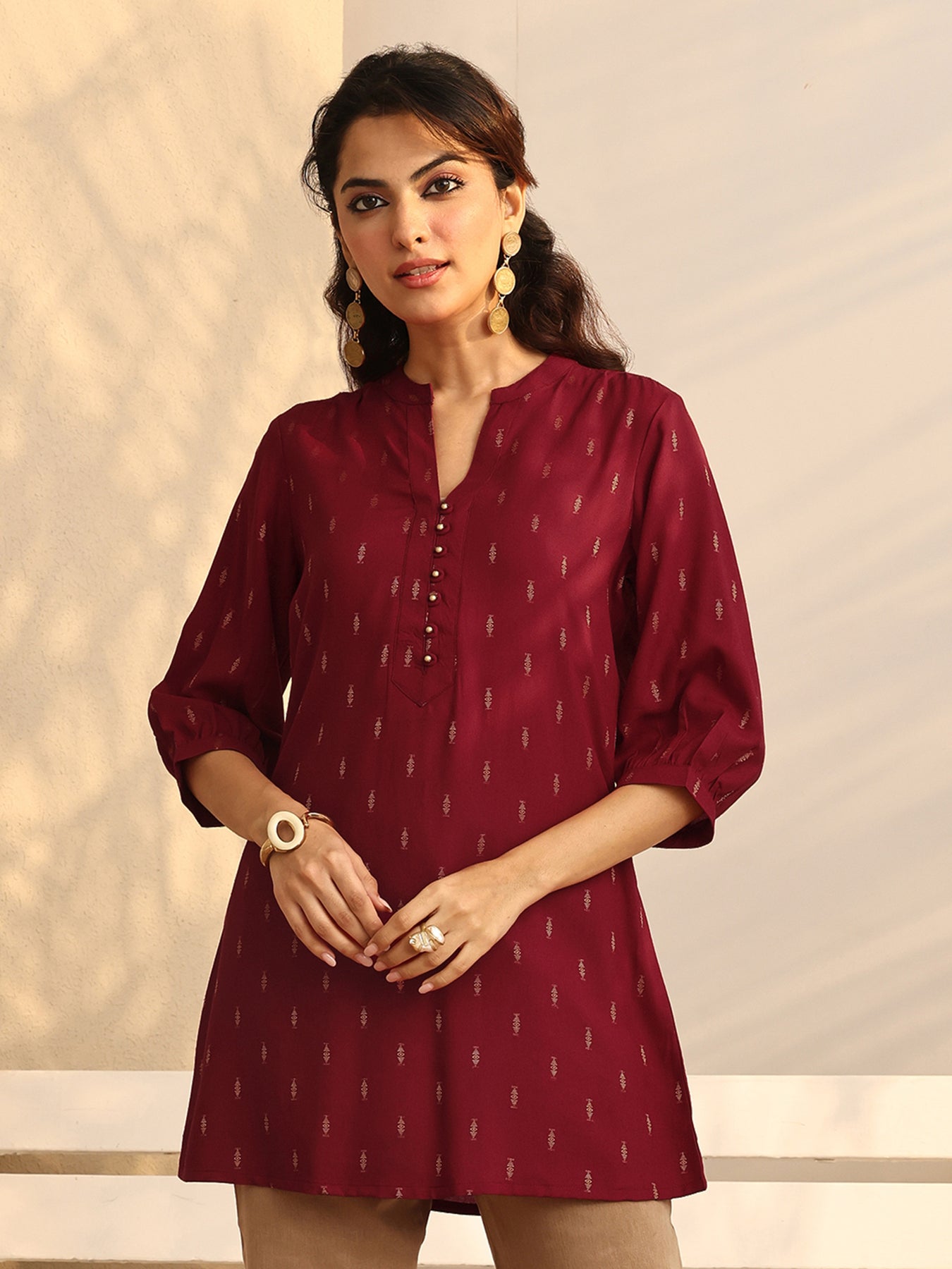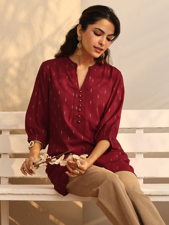 Red Woven Design Rayon Straight Short Kurti