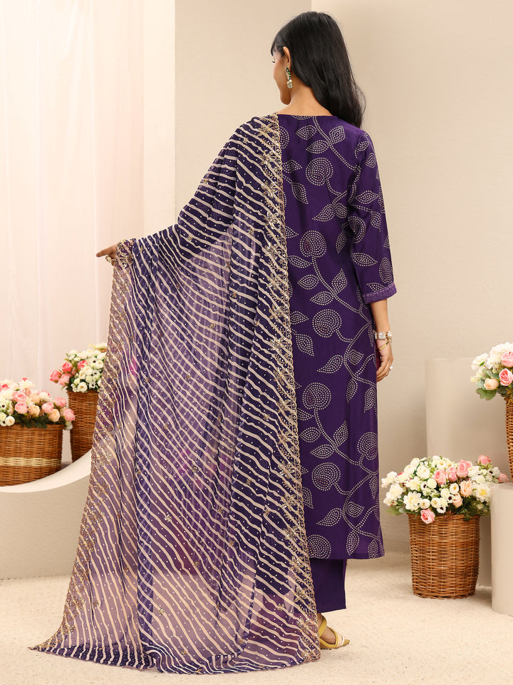 Purple Bandhani Printed Silk Blend Straight Suit Set With Dupatta