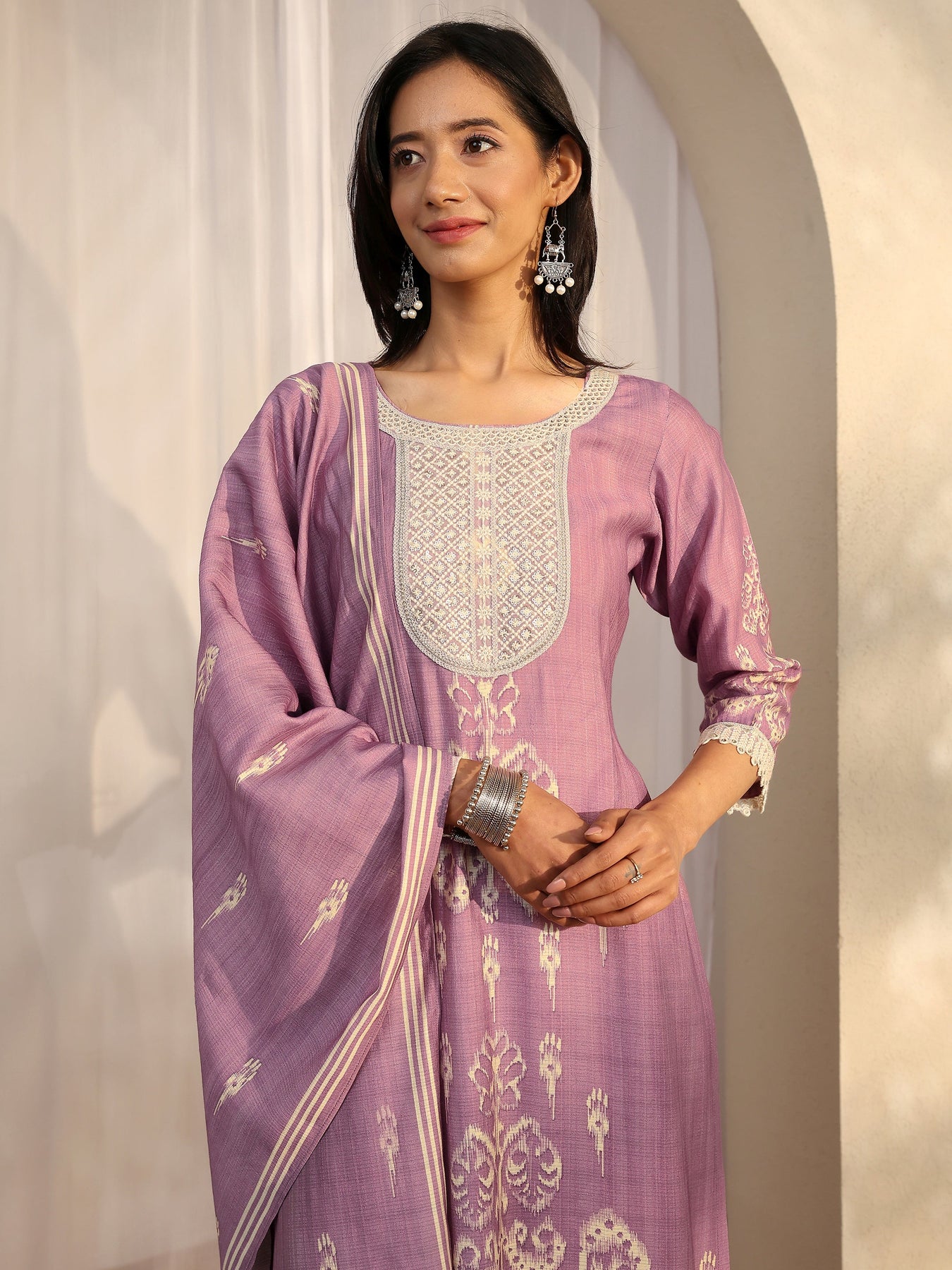 Our 3-piece Lavender Silk blend Straight-fit Kurta Set features a Round Neckline, Regular Sleeves, and statement yoke. Complemented with Straight Pants with a Partially Elasticated waistband and 2 pockets, and an Embroidered dupatta. Adorned with ethnic motif printed, this style is perfect for Festive occasions.