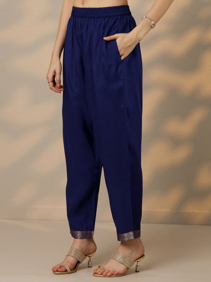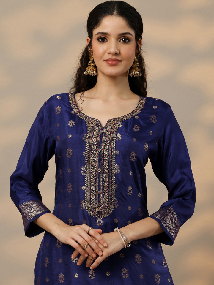 Our 3-piece Navy Blue Silk blend Kurta Set features a Straight-fit kurta with a Sweetheart Neckline, Regular Sleeves, and statement yoke. Complemented with Straight Pants with a Partially Elasticated waistband and 2 pockets, and a Printed dupatta. Adorned with Embroidered accents, this style is perfect for Dark Festive occasions.