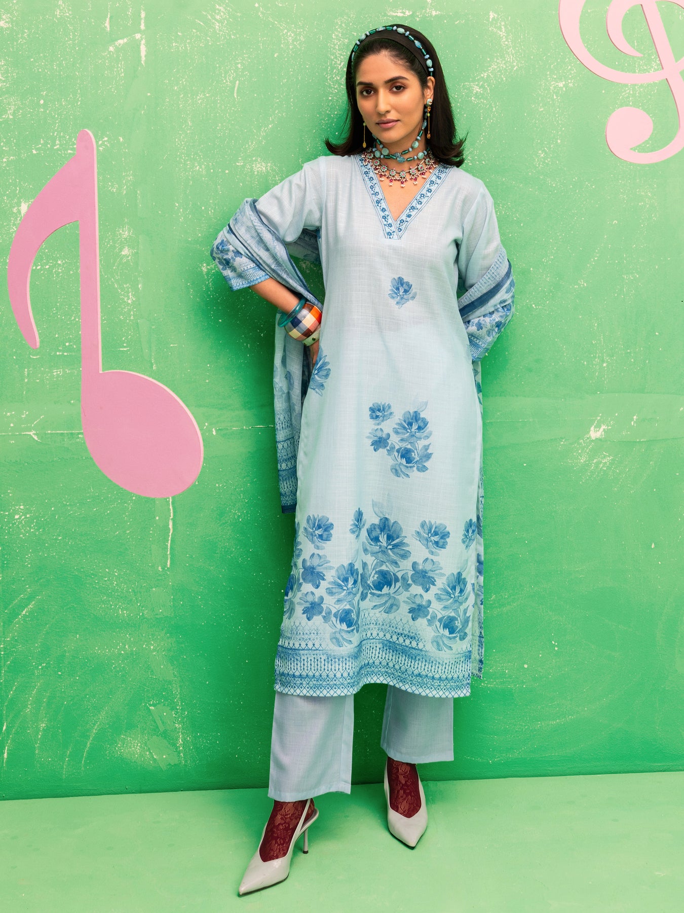 This 3-piece blue linen straight-fit kurta set is designed to bring the sunlit memories of childhood. It features a V-neckline, regular sleeves, and a statement yoke. Complemented with straight pants with a partially elasticated waistband and 2 pockets, and a printed dupatta. Adorned with floral printed, this style is perfect for work wear and casual wear.