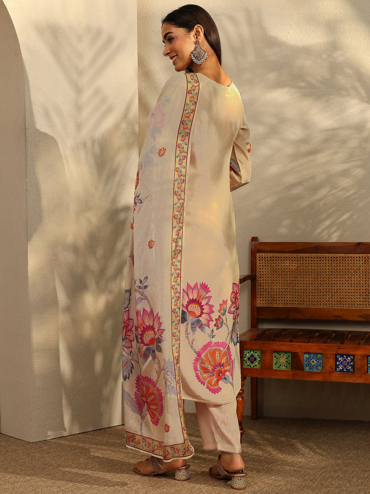 Cream Printed Crepe Straight Suit Set With Dupatta