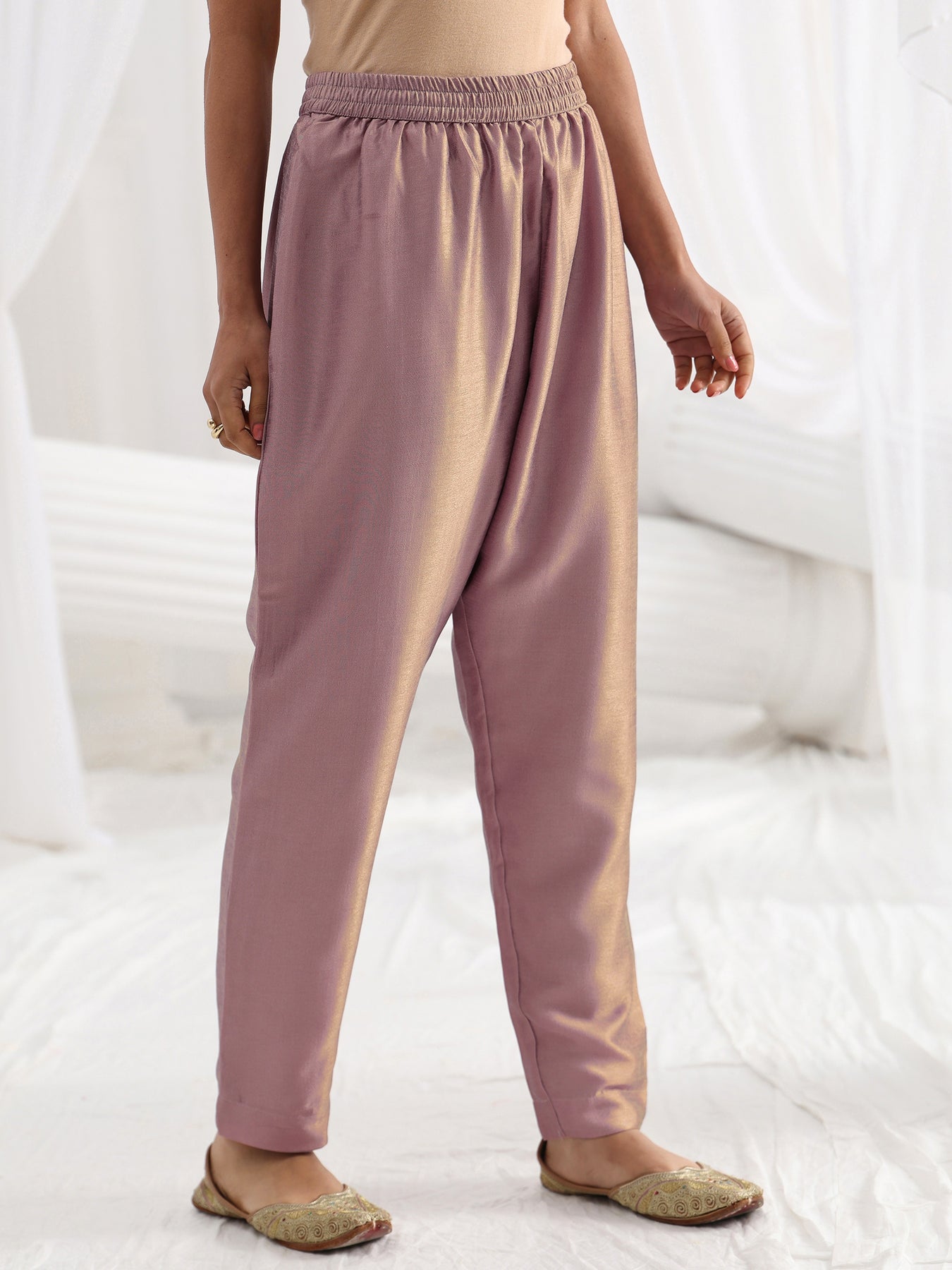 Our 3-piece mauve silk blend Anarkali kurta set features a square neckline, regular sleeves, and statement yoke. Complemented with straight pants with a partially elasticated waistband and 2 pockets, and a printed dupatta. Adorned with floral zari embroidered, this style is perfect for festive occasions.