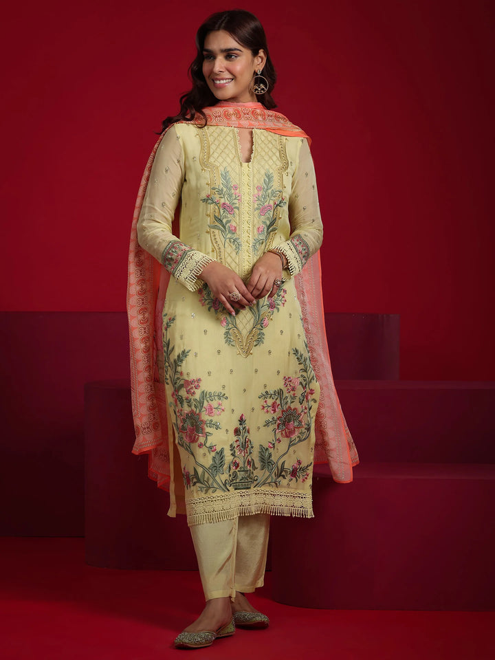Libas Art Lime Green Embroidered Organza Straight Suit With Dupatta