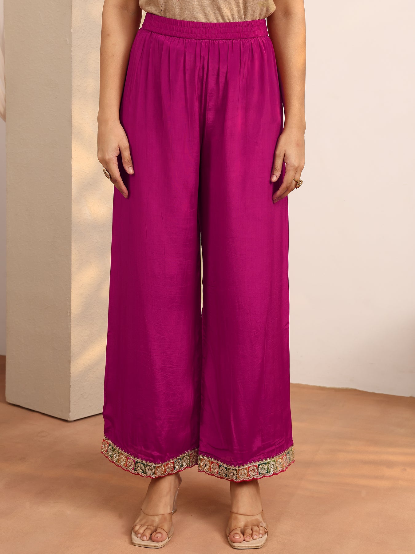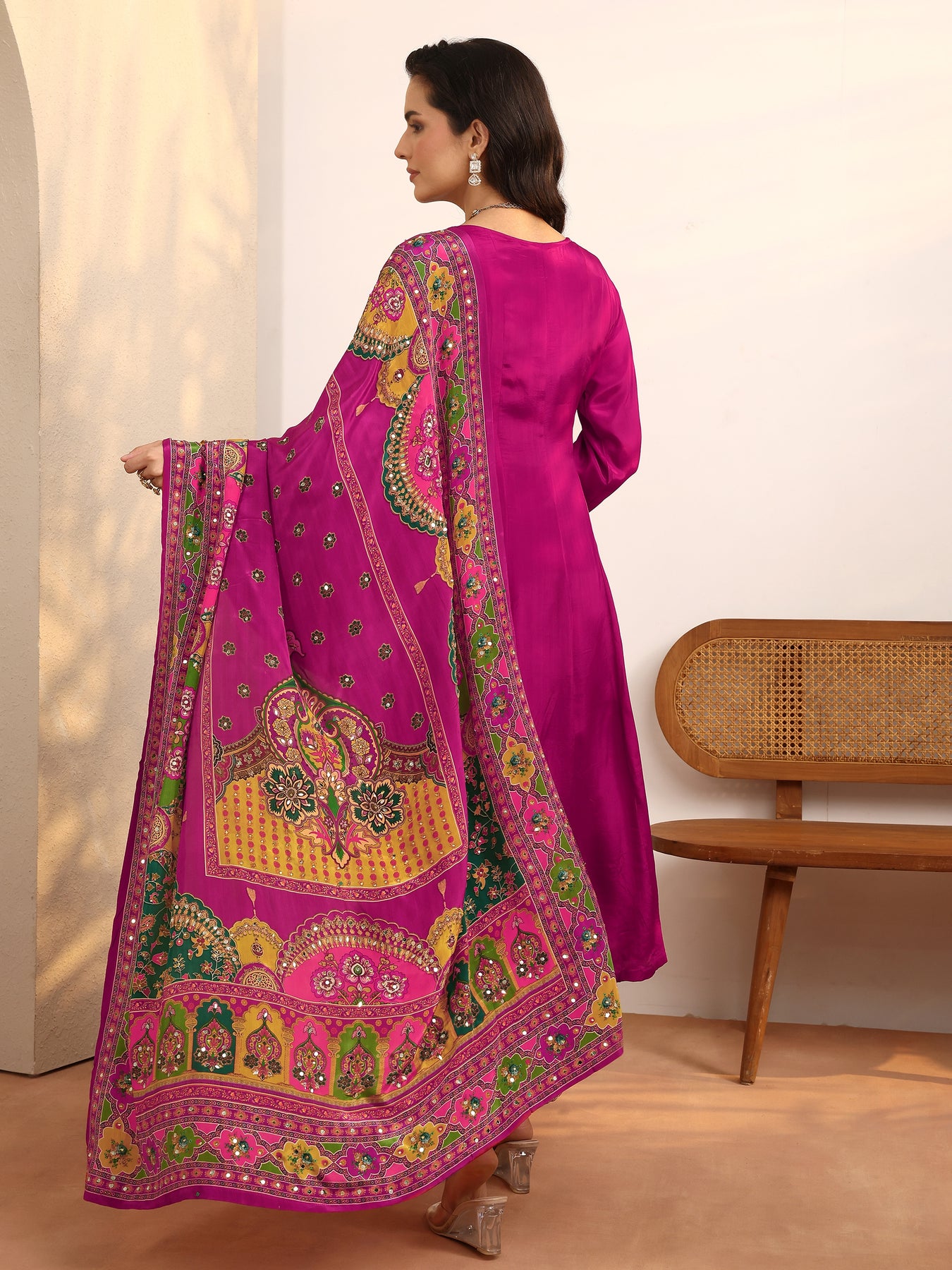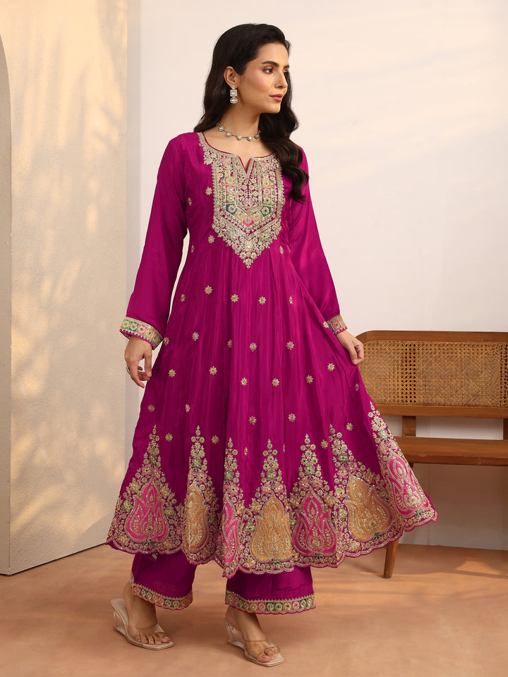 Our 3-piece magenta crepe Anarkali kurta set features a round neckline, regular sleeves, and statement yoke. Complemented with lining and straight pants with a partially elasticated waistband and 2 pockets, and an embroidered dupatta. Adorned with embellished, this style is perfect for dark festive occasions.