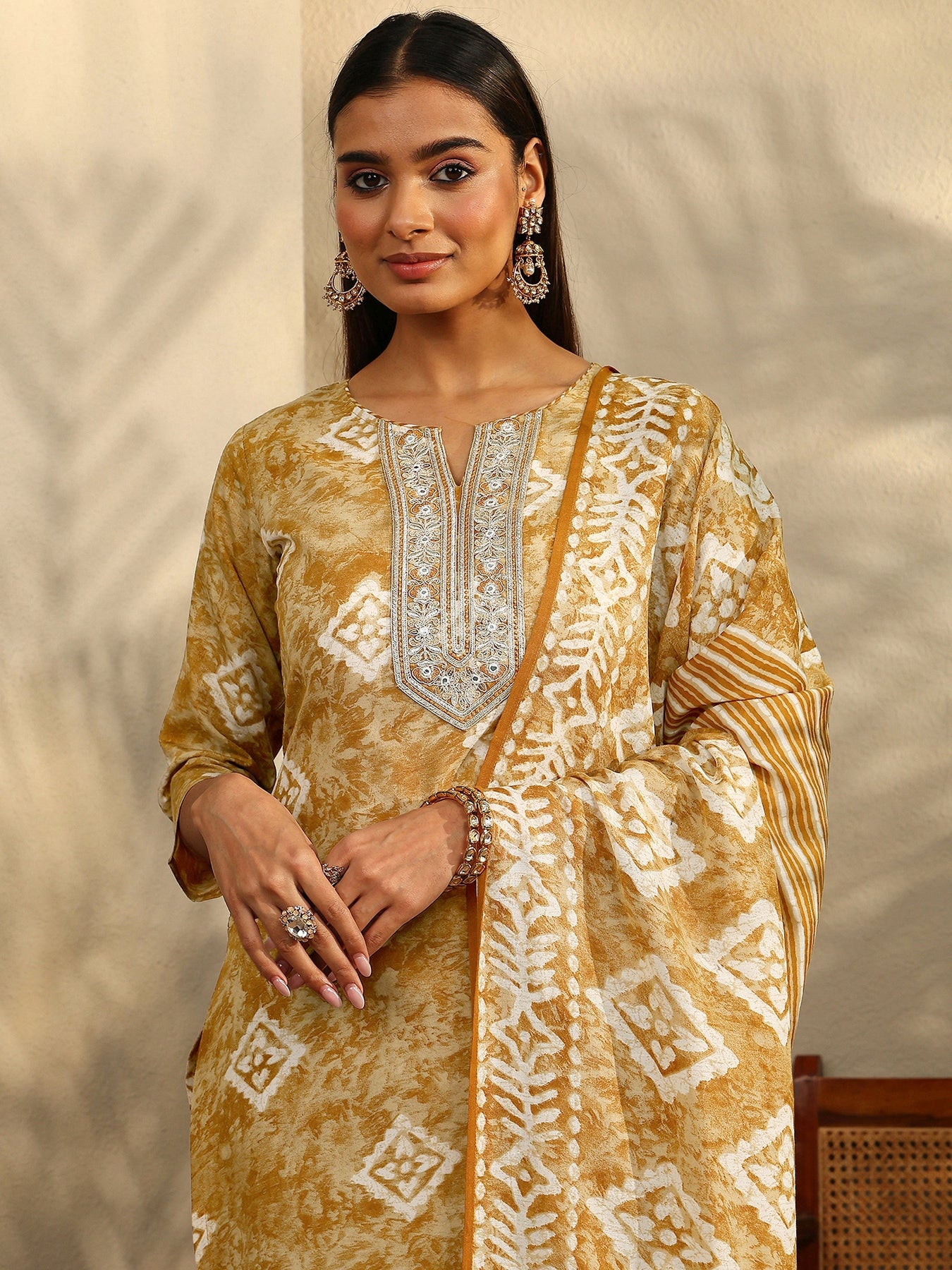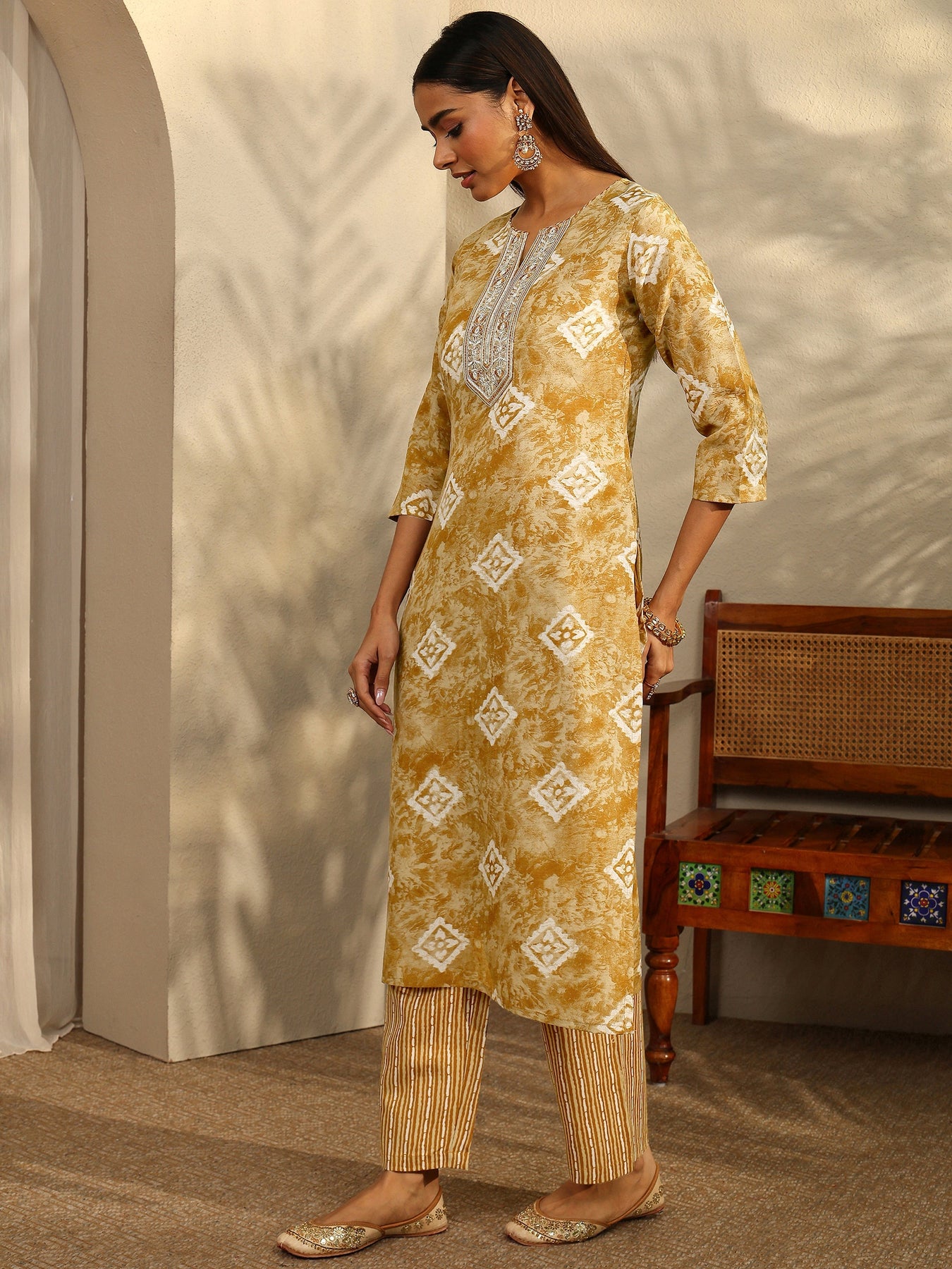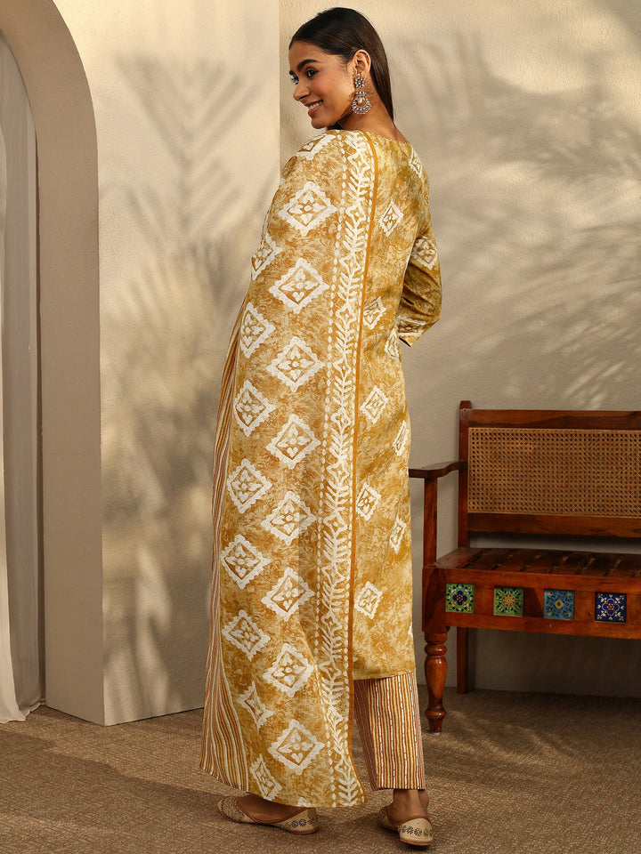 Mustard Block Printed Cotton Blend Straight Suit Set With Dupatta
