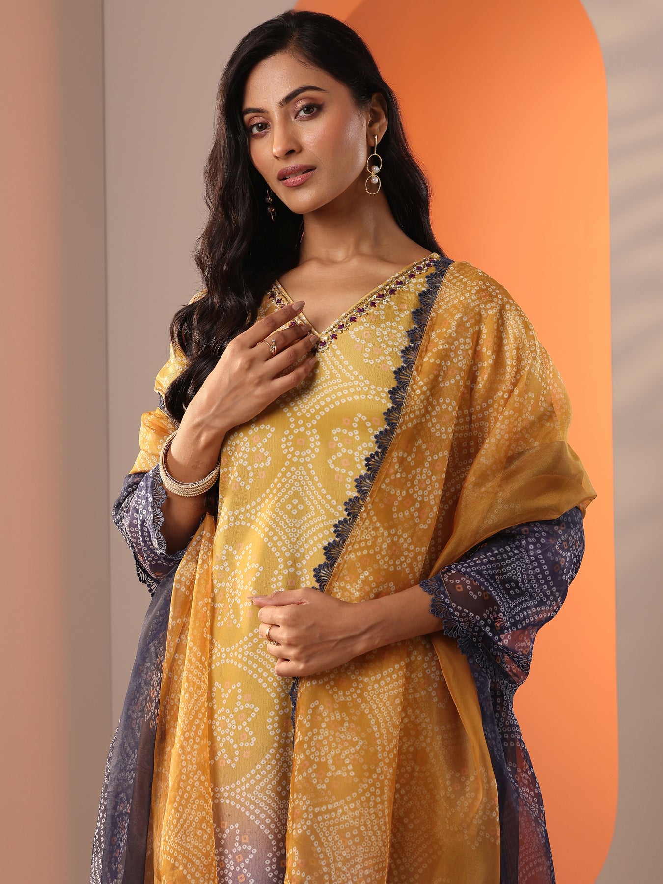 Our 3-piece Yellow and Navy Blue Chinon Straight-fit Kurta Set features a V-Neckline, Regular Sleeves, and statement yoke. Complemented with Straight Pants with a Partially Elasticated waistband and 2 pockets, and a Bandhani inspired print dupatta. Adorned with Bandhani inspired print, this style is perfect for Festive occasions.