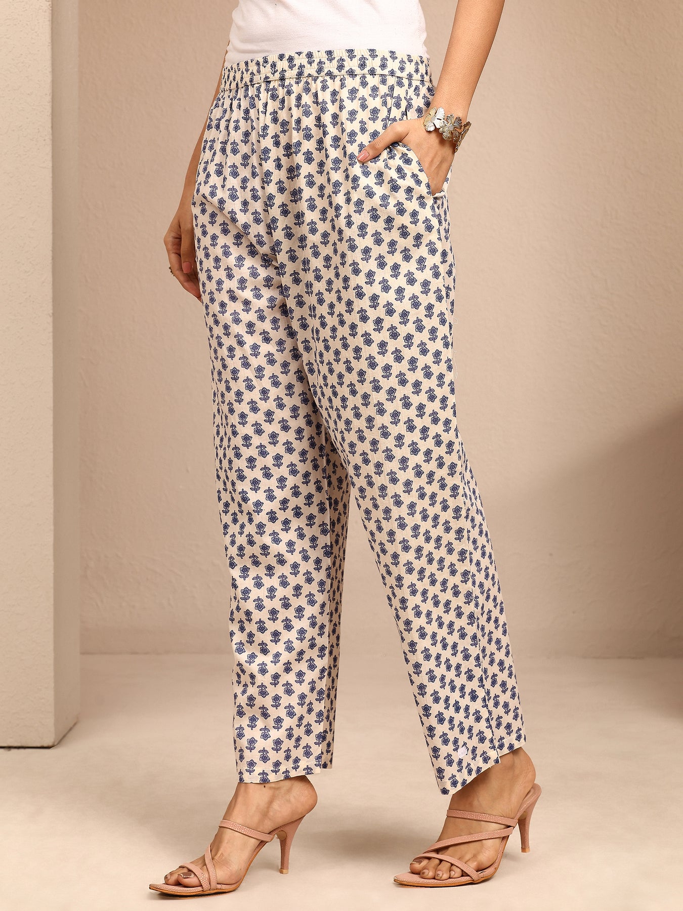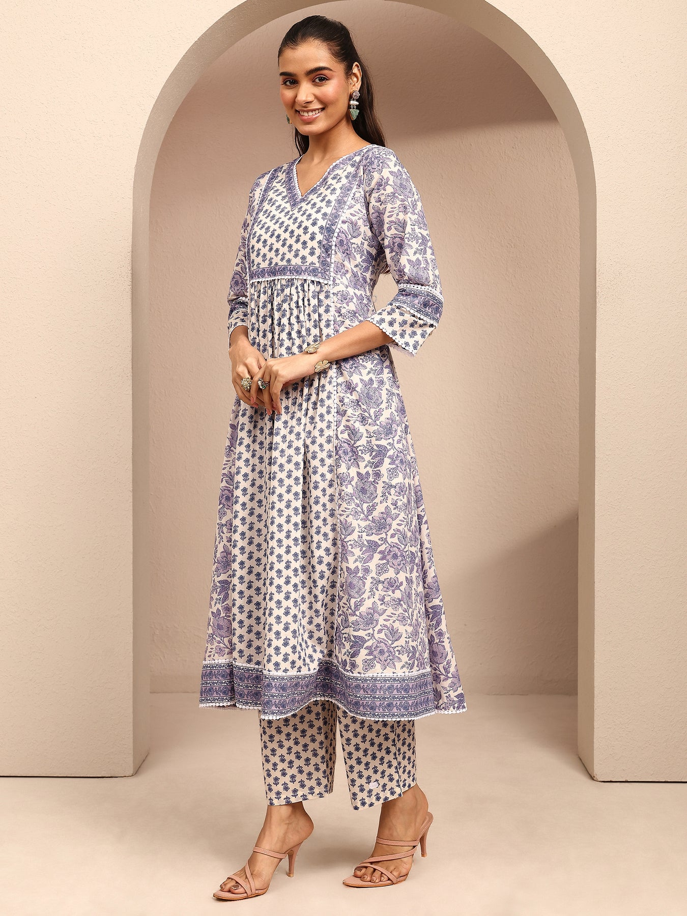 Our 3-piece purple and white cotton Anarkali kurta set features a V-neckline, regular sleeves, and statement yoke. Complemented with straight pants with a partially elasticated waistband and 2 pockets, and a floral dupatta. Adorned with floral printed, this style is perfect for festive occasions.