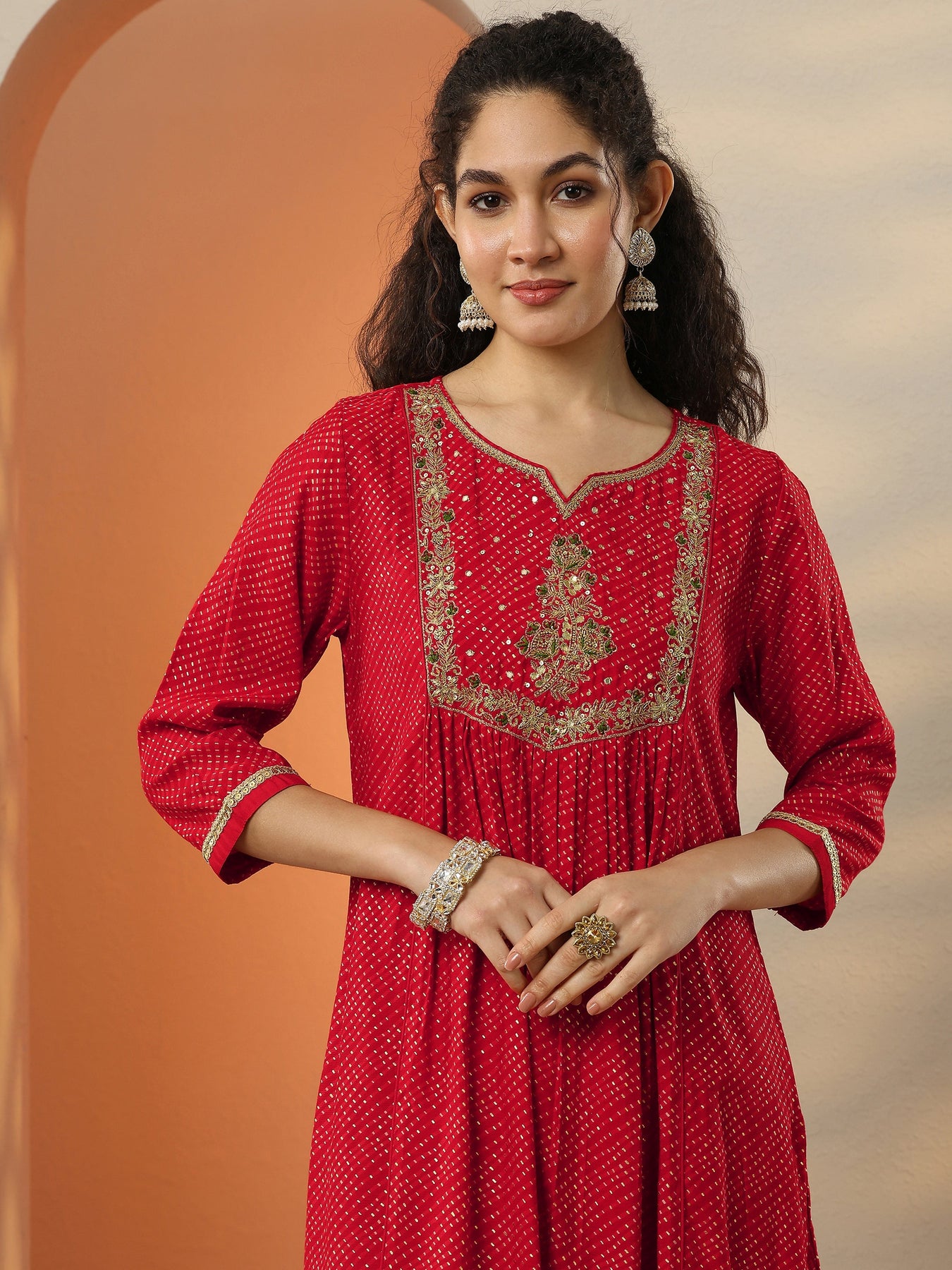 Red Printed Silk Blend A-Line Suit Set With Dupatta