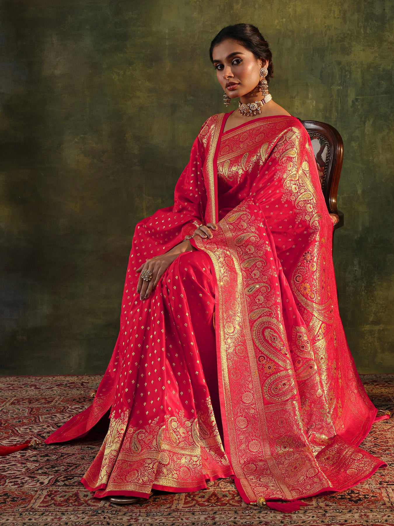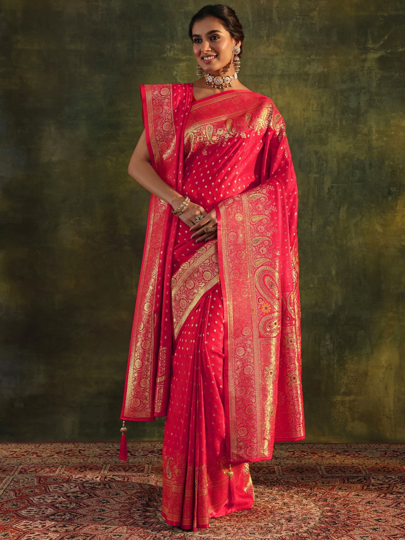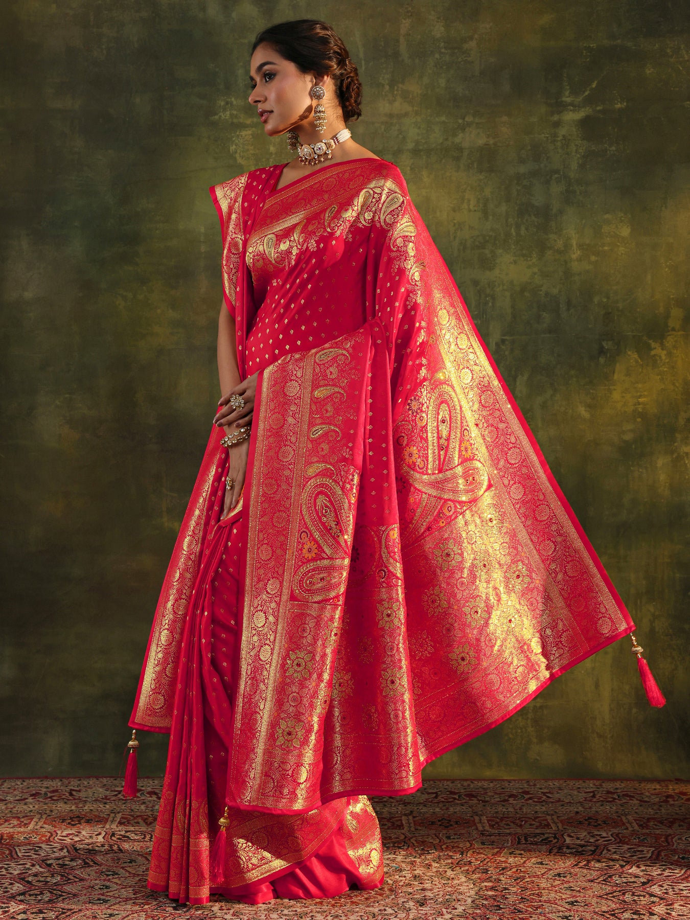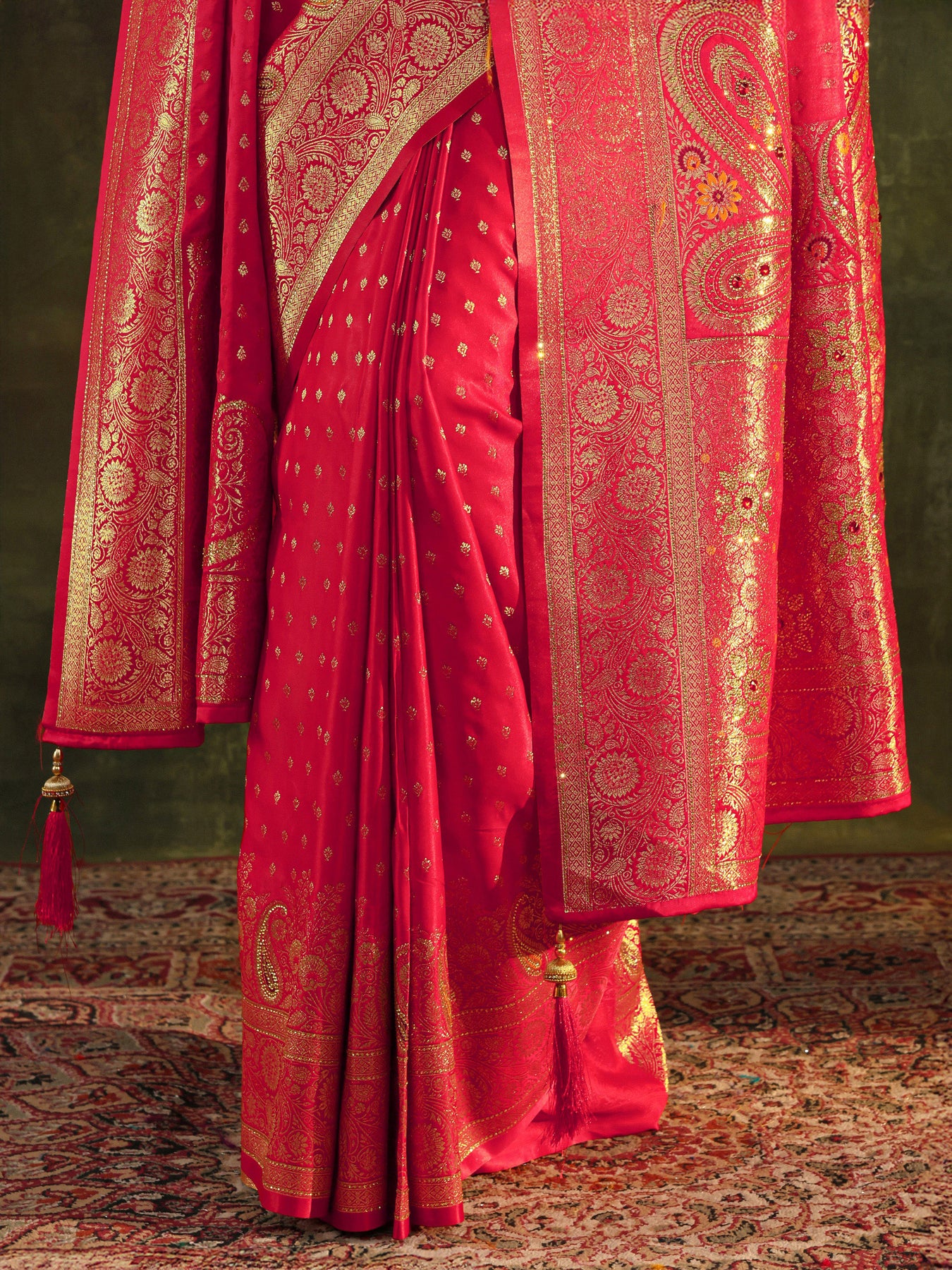 Red Banarasi Silk Saree With Unstitched Blouse And Dupatta