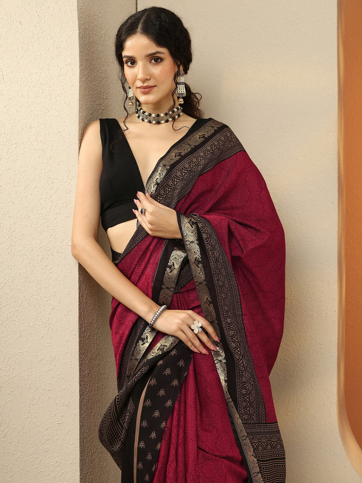 Our Red Ethnic Motif Printed Silk Blend Saree. Complemented With An Unstitched Blouse Piece. This Charming Saree Is Perfect For Festive Occasions.