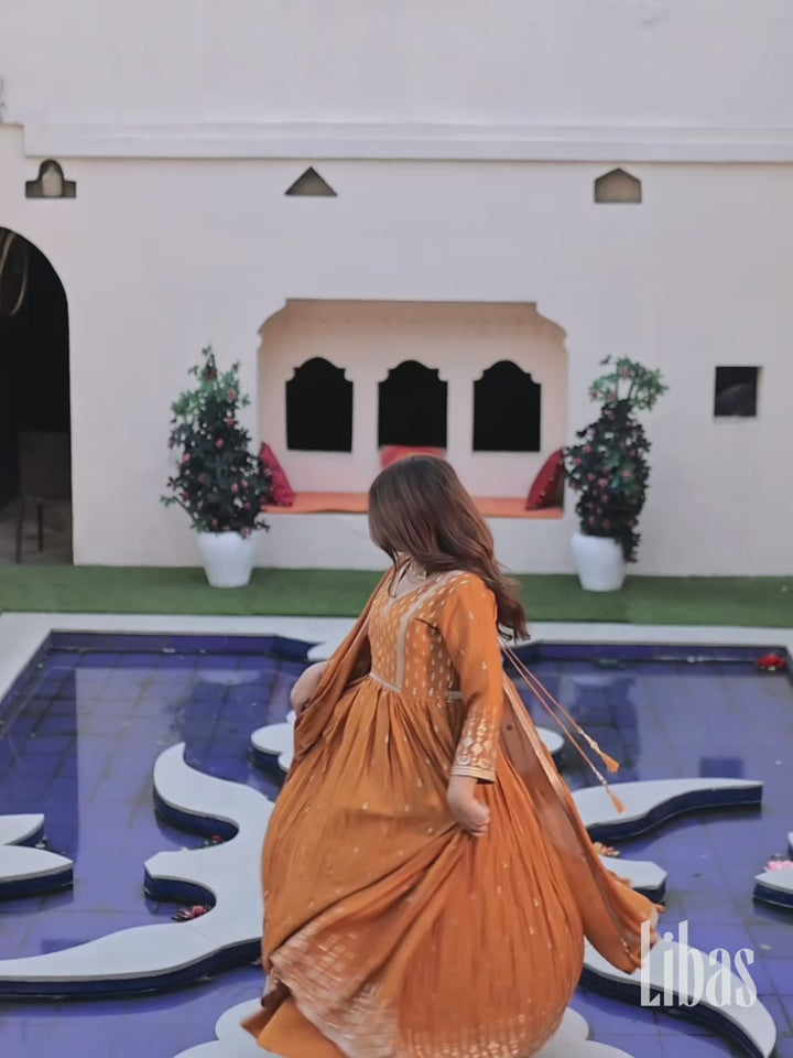 Our 3-piece mustard Chinon Anarkali kurta set features a V-neckline, regular sleeves, and a statement flared yoke. Complemented with salwar pants with a partially elasticated waistband and an embroidered dupatta. Adorned with embroidered embellishments, this style is perfect for festive occasions.