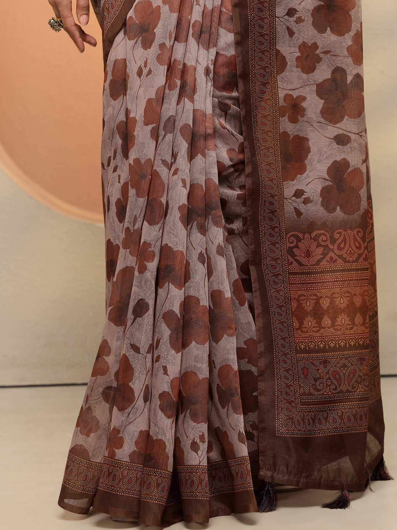 Our Brown Printed Silk Blend Saree Features Captivating Floral Print. Complemented With A Blouse Piece. This Charming Saree Is Perfect For Festive Occasions.