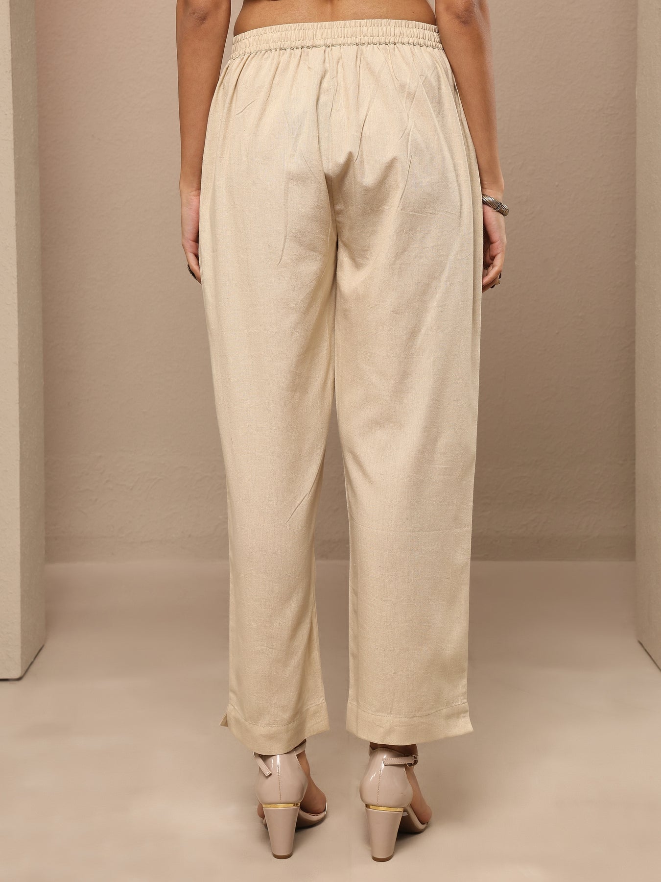 Our beige cotton trousers feature a mid-rise waist style with slip-on closure and 2 pockets. Adorned with solid, this intricate style is perfect for Casual Wear.