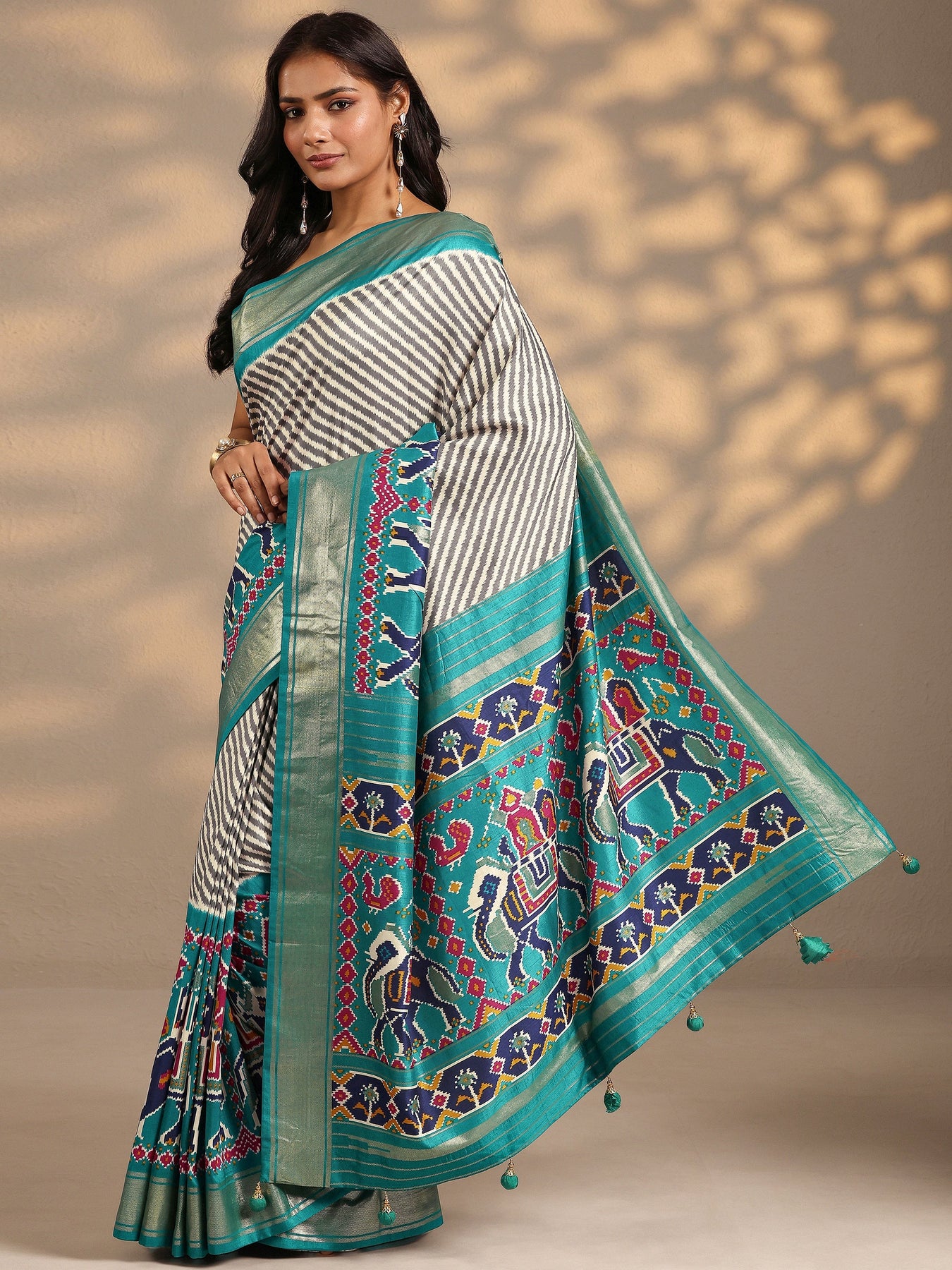 Our Teal Printed Silk Blend Saree Features Captivating Ethnic Motifs Print. Complemented With A Blouse Piece. This Charming Saree Is Perfect For Festive Occasions.