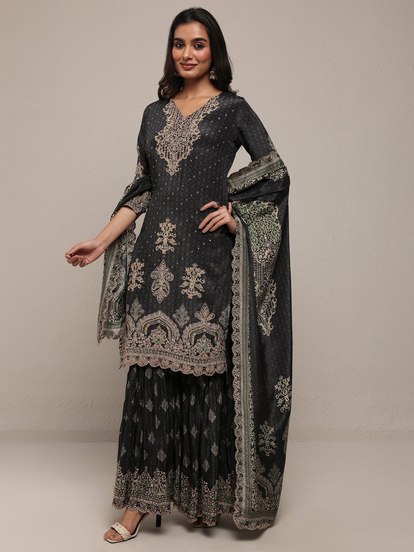 Libas Art Black Embroidered Silk Crepe Straight Suit Set With Dupatta