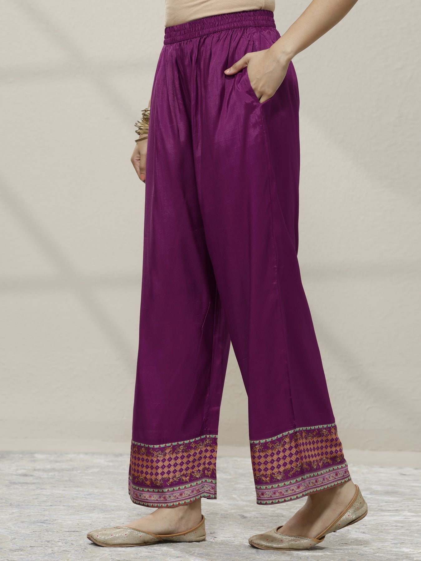 Our 3-piece Purple Silk blend Straight-fit Kurta Set features a Round Neckline, Regular Sleeves, and statement Yoke. Complemented with Straight Pants with a Partially Elasticated waistband and 2 pockets, and a Solid dupatta. Adorned with ethnic motif printed, this style is perfect for Dark Festive.