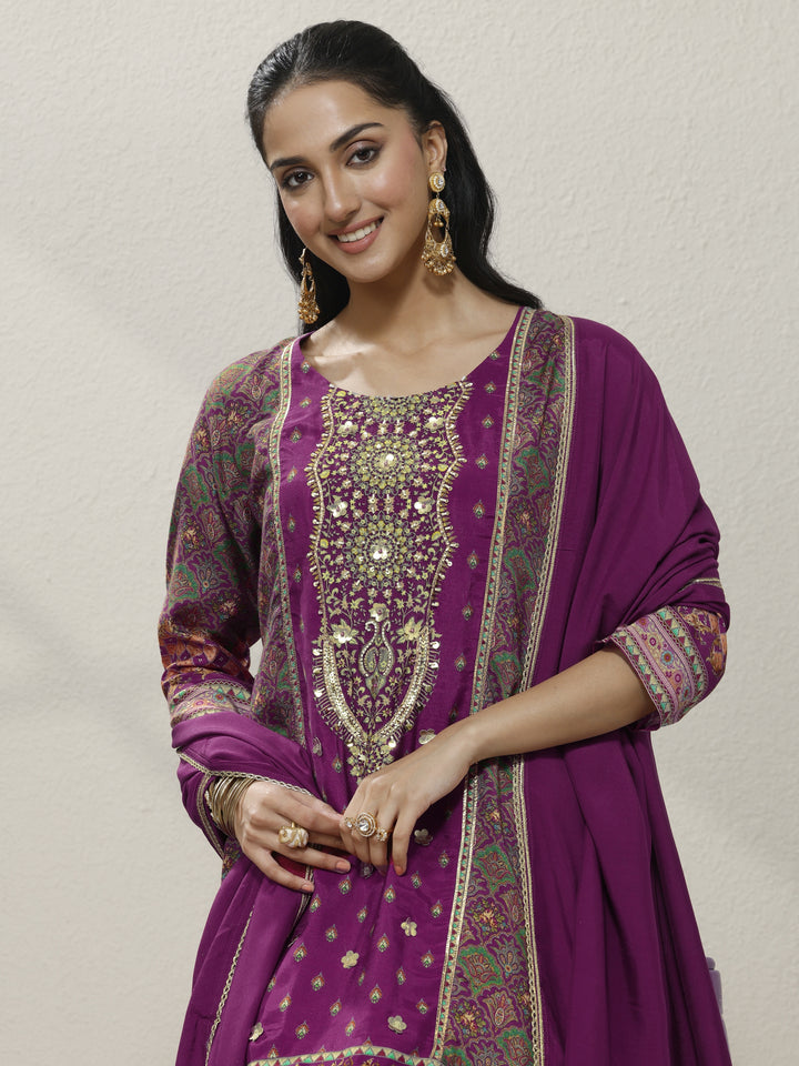 Magenta Embroidered Silk blend A-line Suit Set With Dupatta