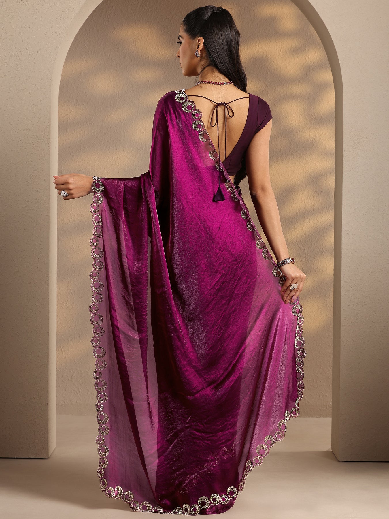 Our magenta printed silk blend saree features captivating embellishments. Complemented with a Unstitched blouse. This charming saree is perfect for festive occasions.