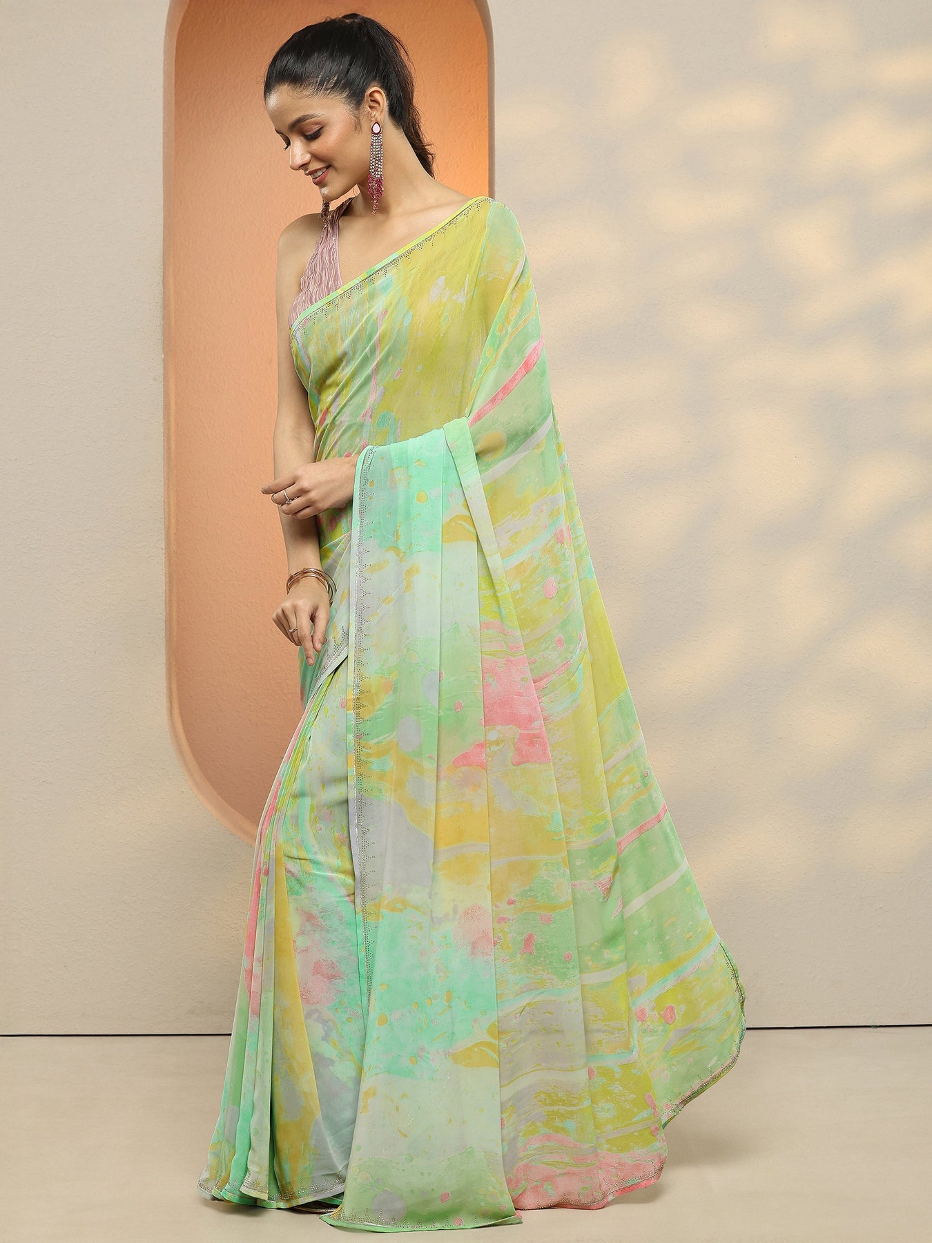 Our Multi-Colored Printed Georgette Saree Features Captivating Abstract Print. Complemented With A Stitched Blouse. This Charming Saree Is Perfect For Festive Occasions.