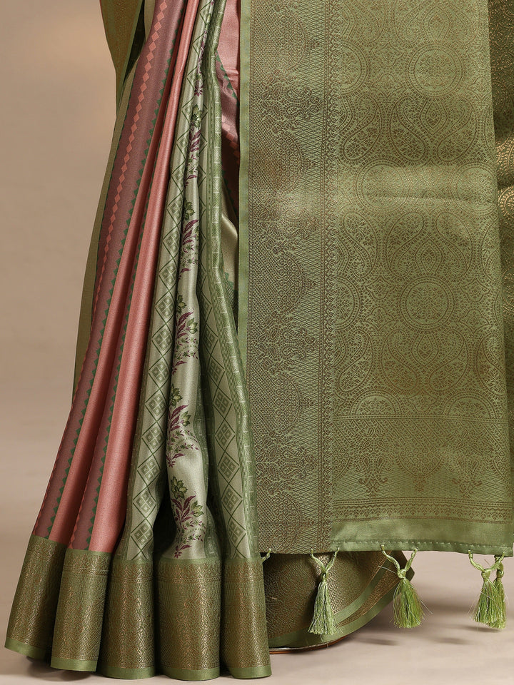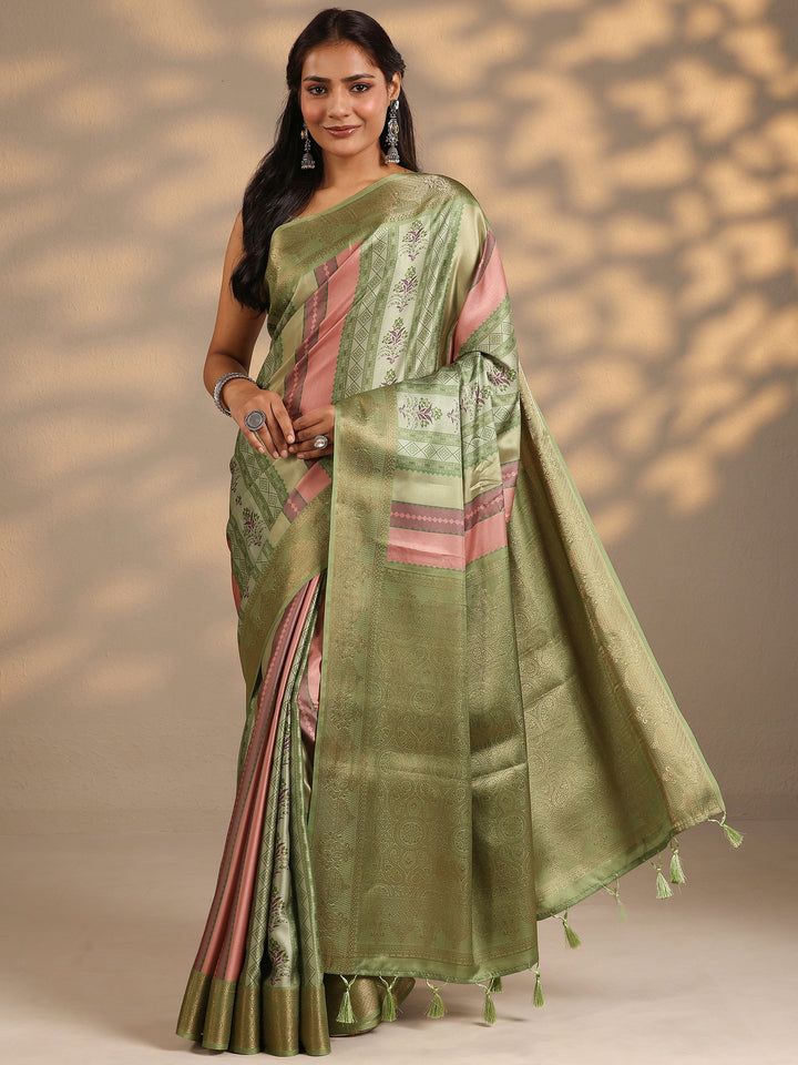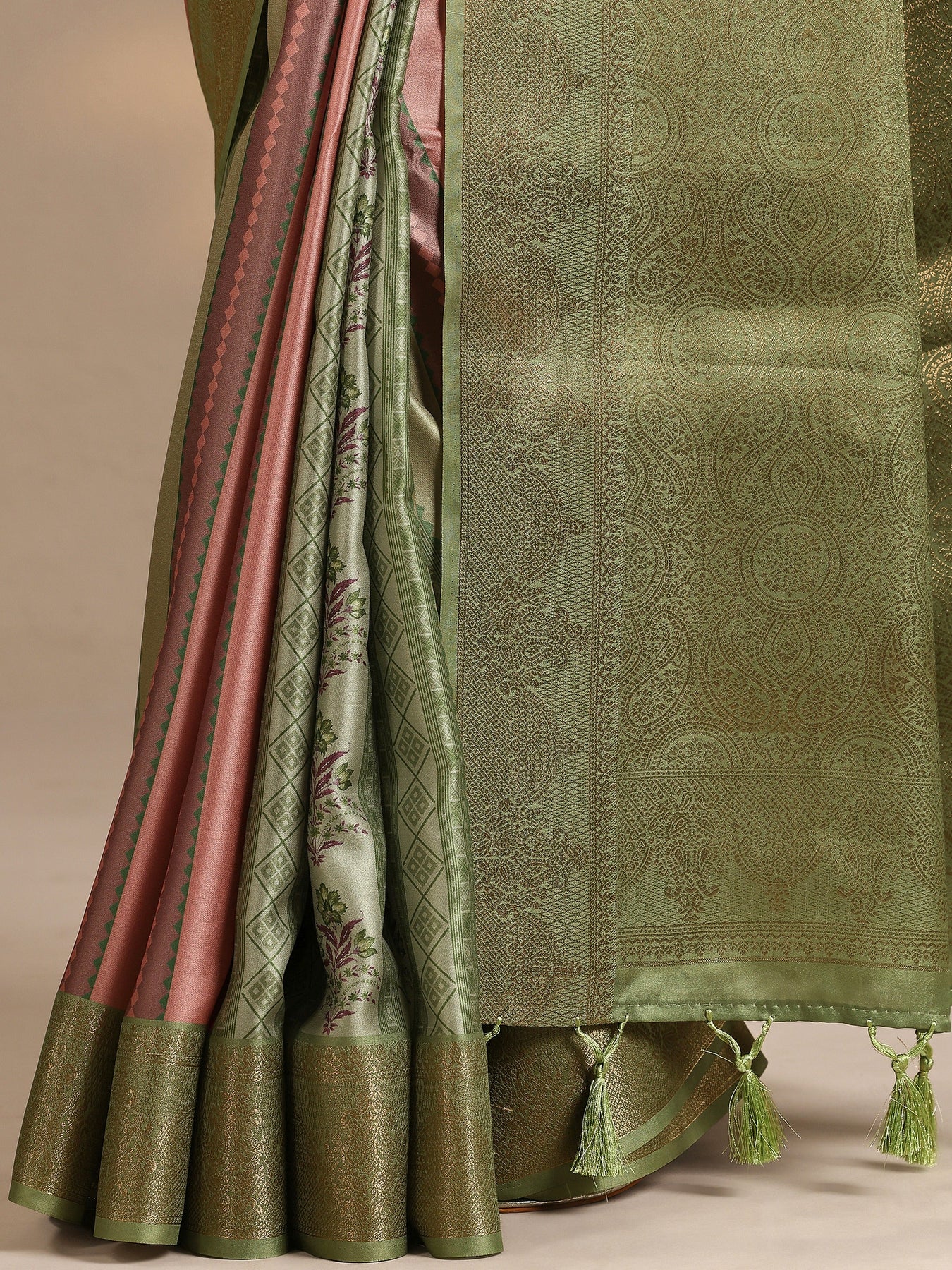 Our Olive Printed Silk Blend Saree Features Captivating Top Pattern Print. Complemented With A Blouse Piece. This Charming Saree Is Perfect For Occasion.