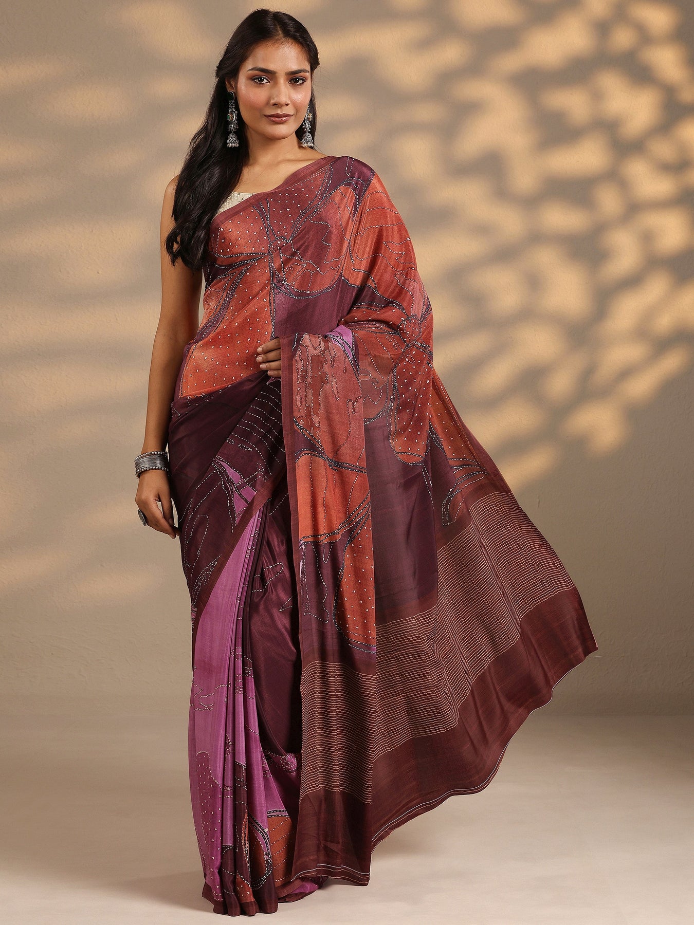 Our Burgundy Printed Silk Blend Saree Features Captivating Bandhani Print. Complemented With A Blouse Piece. This Charming Saree Is Perfect For Festive Occasions.